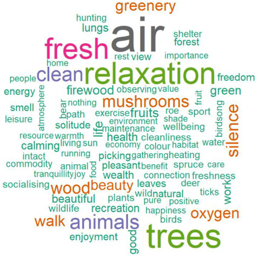 Figure 5 shows a word cloud of associations to the word “forest.” Verbatims that were used more frequently are shown in larger letters. It turns out that the most frequently recorded word was air and nature, followed by relaxation and trees.