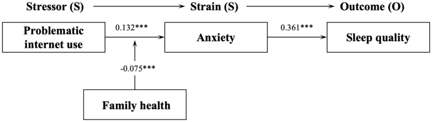 A sample of 4,365 adolescents in China participated in this study, which utilized questionnaires and other methods to develop a novel SSO model. In this model, problematic internet use was considered as the stressor, anxiety as an indicator of tension, and sleep quality as the ultimate outcome. Family health was introduced as a moderating variable.
