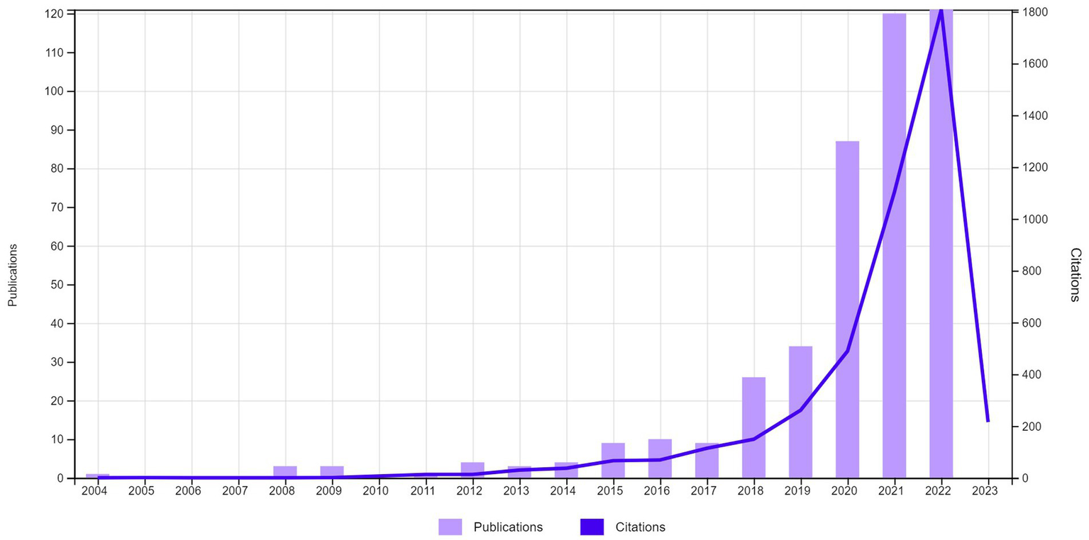 From 3,433 articles on DL, education dominates (39.4%), followed by communication (8.97%) and information sciences (8.09%). Research began in 1994, with fewer than 100 publications annually until 2017 (Figure 1). A significant increase in publications occurred from 2017 (n = 96) to 2018 (n = 247), a 2.5x increase. Citations also significantly increased from 5,188 in 2020 to 8,772 in 2021.