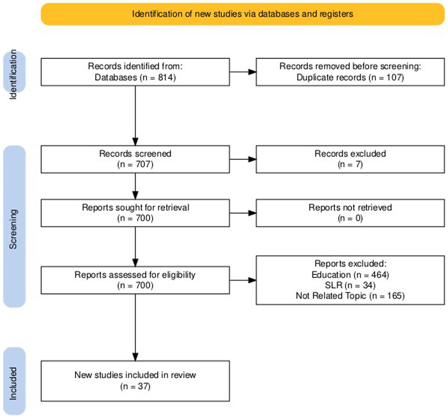 We conducted this systematic literature review (SLR) for articles that were published until July 2024, using the PRISMA method to select articles (Figure 7). SLR can be explained as a systematic method for collecting, selecting, identifying, evaluating, and synthesizing the evidence from previous research to identify research gap and provide a research agenda (Tranfield et al., 2003). We expanded our database search beyond WoS to include SCOPUS, Academic Search Premier (EBSCO), and ProQuest to obtain a broader range of articles. We used similar Boolean operators with the bibliometric analysis; however, we excluded the term innovation during the SLR, which is broader and sometimes irrelevant to the research question about IWB (see Table 2). After removing duplicates and applying exclusion criteria, our final dataset comprised 37 articles.