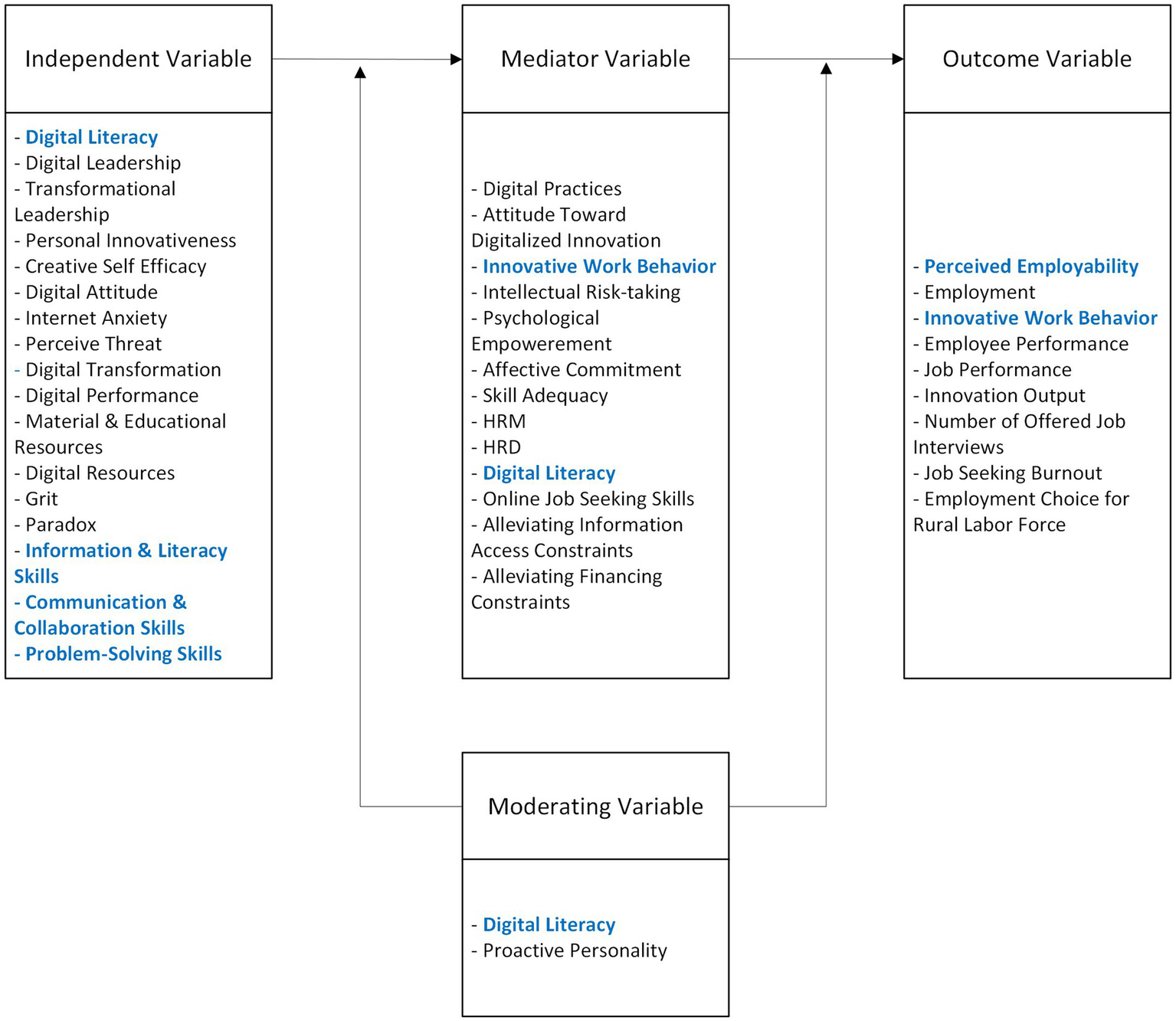 The digital era triggered modifications to organizational models and heightened workplace diversity by reshaping task execution (Phillips et al., 2017). This era also led to a profound evolution in the workplace, replacing traditional job roles and creating new ones (Van Laar et al., 2017). This shift has presented a new challenge for current and future workers: finding and maintaining jobs in a labor market that increasingly prioritizes individuals with higher knowledge or higher-order thinking skills. This shift in the labor market has profound implications for employability. Employability is employees’ ability to acquire and maintain a job (Habets et al., 2021) by continuously increasing knowledge, skills, and attitudes (Van der Heijden et al., 2018) so they can adapt to changing times and labor market demands (Stoffers et al., 2020a; Hoedemakers et al., 2023). Individuals who possess these skills are more likely to secure and maintain stable employment in an increasingly competitive job market. In today’s digital workplace, workers are pushed to have digital literacies to accommodate the digital technologies. DL underlines the need for proficiency in using digital technology devices when accessing and searching for information, and with regard to the protection of personal data, privacy and problem-solving (Schauffel et al., 2021; Ferrari, 2013). DL is more than skills in a digital environment (Van Laar et al., 2017); it can enable employees to communicate and collaborate effectively, build professional networks, and efficiently access information such as searching for job opportunities, upskilling based on online resources to meet changing workforce need. Previous research also show that DL enhances employability (Tinmaz et al., 2022; Schauffel et al., 2021). This ability gives a higher chance for both future but also present workers to have a good work opportunity in this digital era.Organization’s survival depends on their ability to deliver cutting-edge solutions consistently (Henderikx and Stoffers, 2022), and therefore they must not only adapt but also innovate products proactively (Stoffers et al., 2020a). To make an innovative product, workers are now required to have updated skillsets that align with industry requirements (Van der Heijden et al., 2018) and result in innovative performance that ensures distinctiveness and continuous organizational development (Stoffers et al., 2020b). This condition relates to innovative work behavior (IWB) that denotes an individual’s capacity to initiate, promote, and execute fresh ideas, goods, and services (Janssen, 2000; De Jong and Den Hartog, 2010), thereby fostering the organization’s innovative abilities (Stoffers et al., 2020c). When previous research emphasizes the need for competence-based antecedents of IWB, we acknowledge that DL is one of the important skills for supporting IWB. DL enables individuals to acquire new knowledge from digital media, creatively solve problems through critical evaluation of online information and collaborative insights and contribute to innovative products. DL can help employees for keeping up with developments and innovating product, process and services (Van Laar et al., 2017).