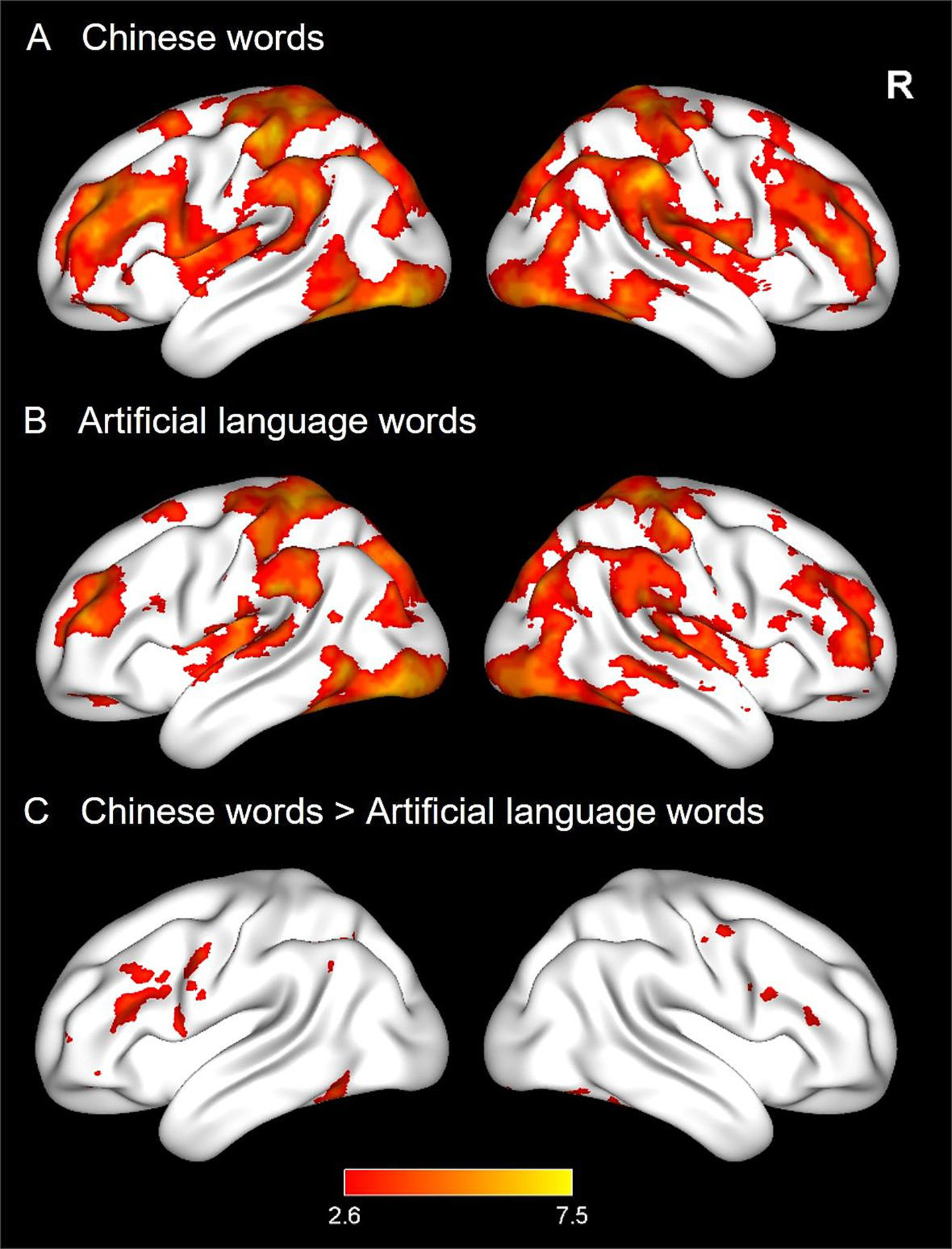 Brain activations of word reading in Experiment 1. Three panels display neural activations of Chinese words (CWs, A), and artificial language words (ALWs, B), as well as stronger activations for CWs relative to ALWs (C).