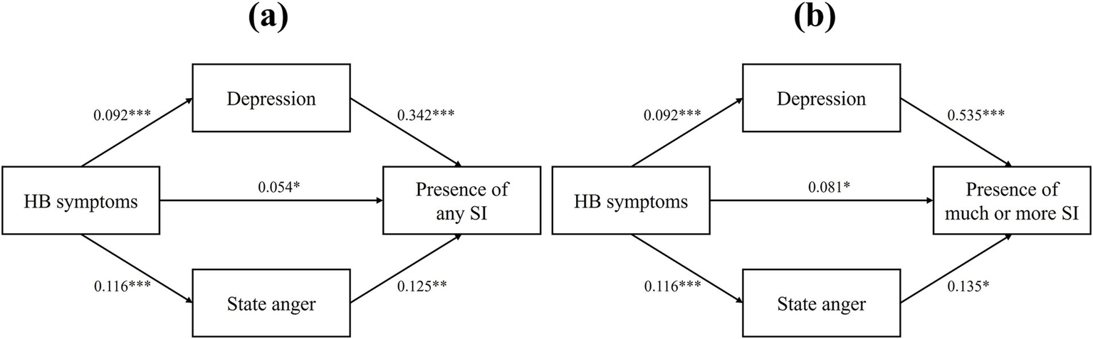 Total 457 participants were included. The survey revealed an overall prevalence of SI of 38.07%, with 18.82% reporting “much” or more SI and 4.81% reporting “very much” SI. Significant differences were found between the SI and non-SI groups in HB symptoms, depression, anxiety, perceived stress, trait anger, state anger, anger-in, and anger-out (all p < 0.001). Logistic regression analysis identified HB symptoms (odds ratio [OR], 1.05; 95% CI, 1.00–1.11; p = 0.050), depression (OR, 1.41; 95% CI, 1.23–1.62; p < 0.001), and state anger (OR, 1.14; 95% CI, 1.05–1.24; p = 0.002) as significant factors for SI. The mediating factors confirmed the direct and indirect effects of HB symptoms on the presence of SI. Pearson’s correlation coefficients between HB symptoms and SI severity ranged from 0.241 to 0.536, with physical symptoms, such as heat sensation and chest pressure, showing high correlations (0.426 to 0.476).