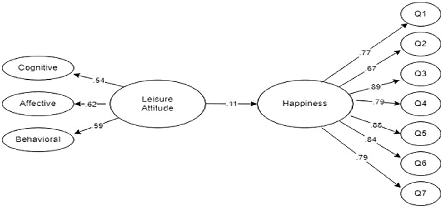 Standardized estimated results of the effect of leisure attitude on happiness (standardized SEM results for Model 1). “Q” represents the items related to the happiness scale.