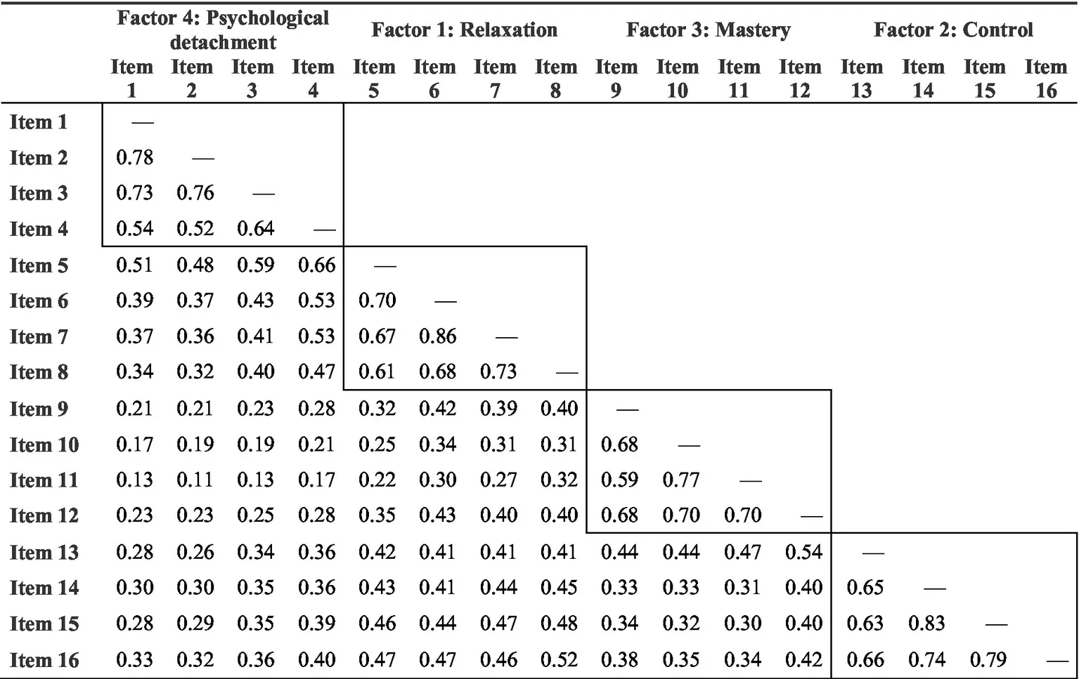 The means, standard deviations, Cronbach’s alphas, and correlations of the variables used in the study are presented in Supplementary material S1. We assessed interitem correlations and found that all items were significantly correlated with each other, with p values less than 0.001. Additionally, items within each dimension showed stronger correlations among themselves than with items from other dimensions (see Table 3). The exploratory factor analysis (EFA) supported a four-factor structure, with eigenvalues greater than one for each factor: relaxation, control, mastery, and psychological detachment (Table 4). Interfactor correlations ranged from 0.27 to 0.61.
