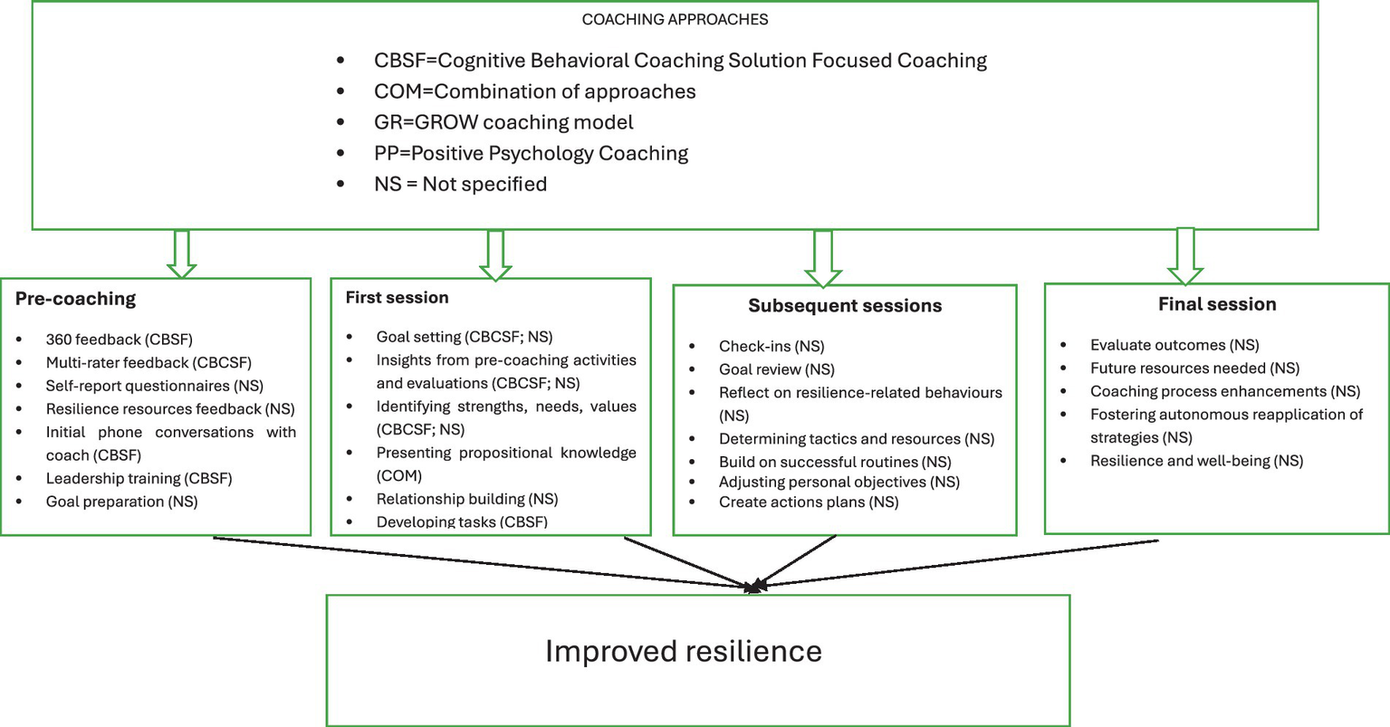 In four of the reviewed studies (Fontes and Dello Russo, 2021; Grant et al., 2009; IJntema et al., 2021; Sherlock-Storey et al., 2013), the insights from pre-coaching activities and evaluations were revisited and assessed during the first coaching session. According to four studies (Archer and Yates, 2017; Dyrbye et al., 2019; Grant et al., 2010; Sherlock-Storey et al., 2013), participants focused on identifying their strengths, needs, values, and areas of resilience during this initial session. This helped set a foundation for the coaching process by ensuring the participants had a clear understanding of their personal capacities and challenges. Goal setting was a key activity in the first session across six studies (Dyrbye et al., 2019; Fontes and Dello Russo, 2021; Grant et al., 2009, 2010; IJntema et al., 2021; Sherlock-Storey et al., 2013), where participants collaboratively established specific objectives that would guide their coaching journey.