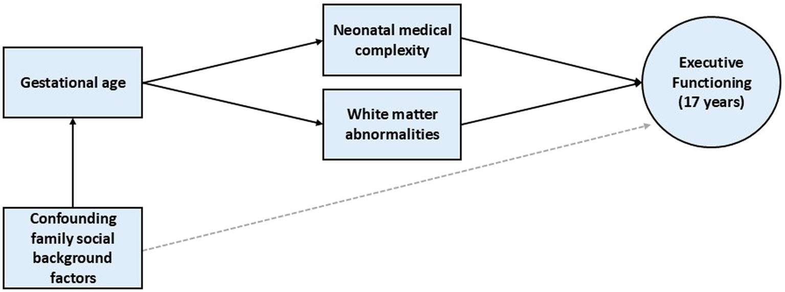 Hypothesized pathways from gestational age to executive functioning outcome at age 17 years.