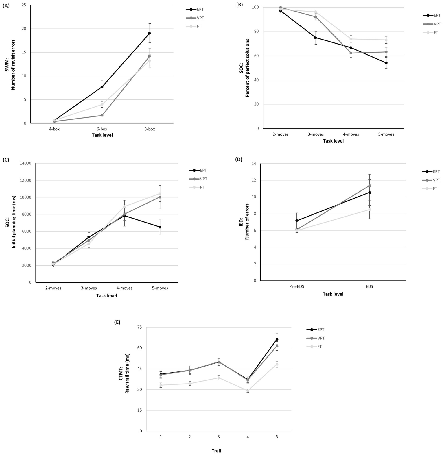 To compare the EF performance of EPT (23–27 weeks), VPT (28–32 weeks) and FT comparison adolescents at age 17 years across three domains including working memory, planning, and cognitive flexibility. Also of interest was the extent to which increasing cognitive demand might impact EF performance for each group, and whether between-group differences might also be explained by family social background factors correlated with very preterm birth.