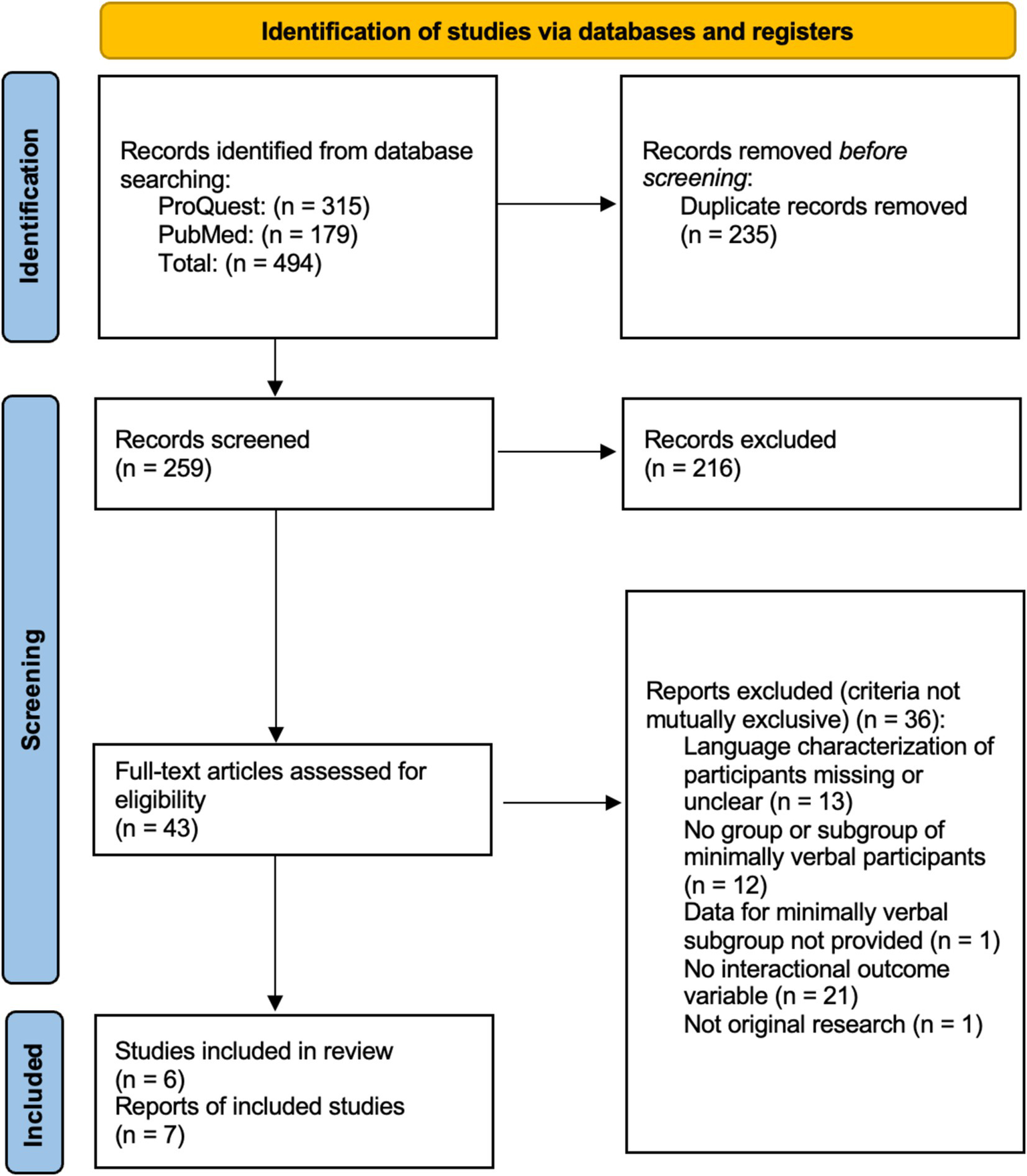 A systematic search procedure was conducted in August 2023 using ProQuest Research Library through the (masked for review) and PubMed. Articles gathered using ProQuest were extrapolated from 66 databases. The publication span searched was 1960–2023 and search terms were applied to the title and abstract. Search terms included the following: “autism,” “autistic,” “autisms,” “ASD” AND “minimally verbal,” “preverbal,” “pre-verbal,” “nonverbal,” “non-verbal,” “nonspeaking” AND “behavioral contingency,” “behavioral contingency,” “contiguity,” “turn-taking,” “mimicry,” “interactional dynamics,” “interaction dynamics,” “synchrony,” “reciprocity,” “attunement,” “coordination,” “social feedback,” “dyadic,” “bidirectional,” “responsiveness,” “alignment,” “coupling,” “mirroring.” The initial search yielded 494 articles. Duplicates were removed, resulting in a total of 259 unique articles. First, a title screening was conducted, then abstracts were screened, then remaining articles were screened for inclusion using the full text (screening procedures detailed below). Inter-observer reliability was calculated by dividing the number of agreements by the total number of agreements and disagreements (Tricco et al., 2018).