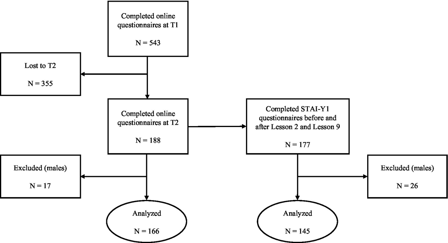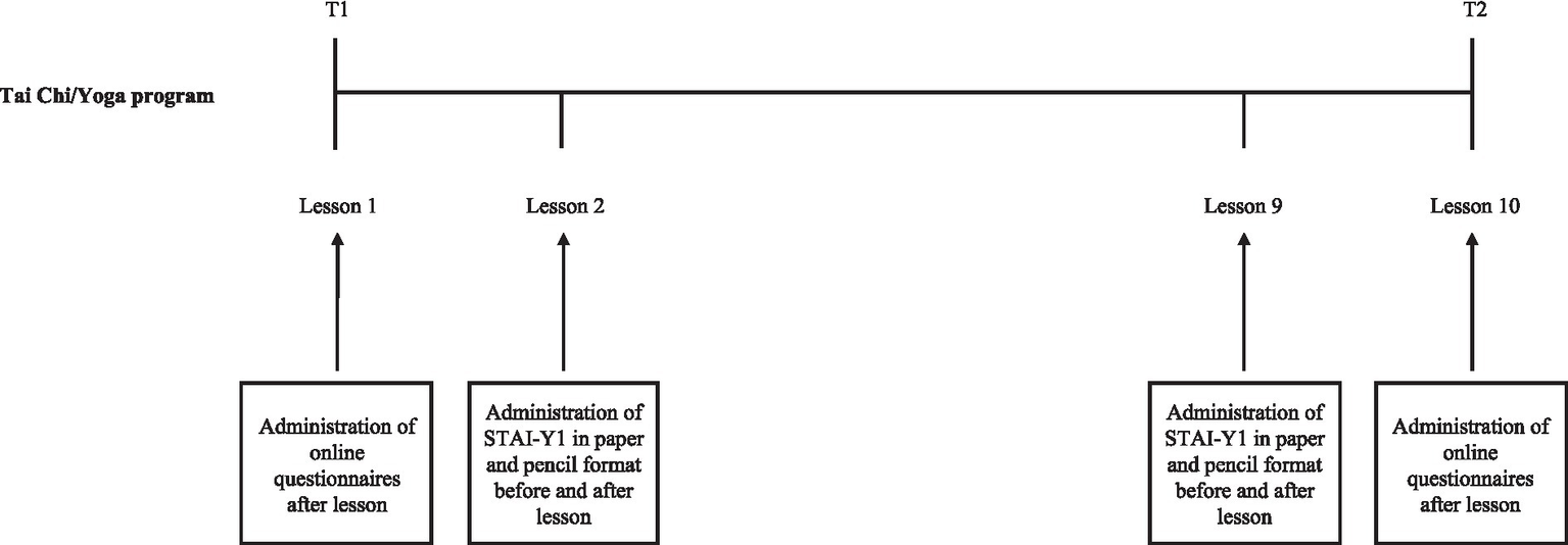 The socio-demographic information schedule was administered before the structured Yoga/Tai Chi intervention only (T1). All other assessments occurred at two time points: before the structured Yoga/Tai Chi intervention (T1) and after the structured Yoga/Tai Chi intervention (T2). Additionally, the state anxiety assessment occurred before and after the second and second-to-last lessons.