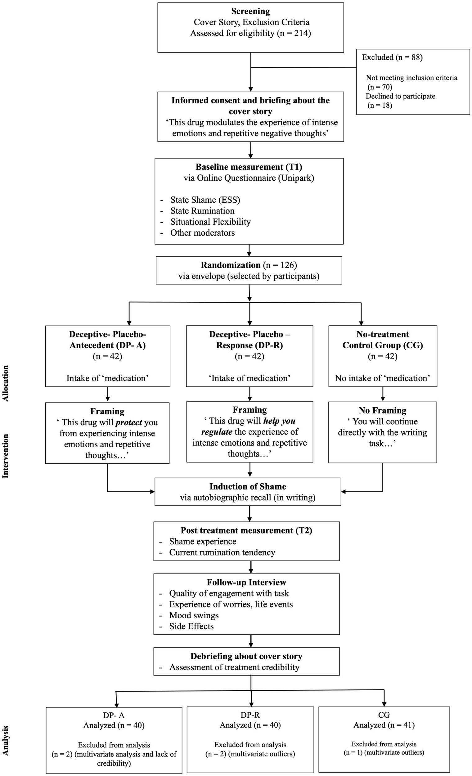 At the beginning of the procedure, participants were informed about the study according to a cover story, suggesting that the study is about the examination of affect regulatory effects of a supposedly antidepressant nasal spray called ‘Doluxefin-direkt’ in an emotion inducing paradigm. Participants were informed that they would be assigned to one of three possible groups: the antidepressant nasal spray, a placebo group or control group when in fact they were assigned to one of the three conditions mentioned above. Subsequently, participants received detailed written descriptions of the medication’s mechanisms mode of action. After giving written informed consent, the participants were informed about the overall procedure of the study. Subsequently, the blood pressure of each participant was measured as part of the cover story. Before the process of randomization, participants filled out different questionnaires regarding their current affective state and tendency to ruminate, levels of depressive symptoms and shame proneness. Then, all participants were randomly assigned to one of the three experimental groups, by choosing a random envelope within a box, containing a small piece of paper where their group assignment was written. Due to study design, investigators and participants of the control group were not blinded and only participants of the deceptive-placebo groups were masked. Participants of the placebo conditions received a treatment (DP-A or DP-R) with specific verbal instructions from study investigators (see 2.2.) and participants of the control group received no treatment (CG) and continued directly with the study procedure. Subsequently, shame was induced in participants through an autobiographic recall adapted from De Hooge et al. (2008). Participants were asked to recall and write in detail about a past event at which they felt particularly inadequate, ashamed, or inept for about 10 min. Afterwards current experience of shame, rumination and cognitive flexibility were assessed again. At the end of the study investigators conducted a follow-up interview to assess treatment credibility and experienced side effects. Afterwards, participants were told about the cover story and deception and then informed about the actual aims of our study. Each experimental investigation was conducted by one of the three involved psychology master students at a laboratory room at the Psychology Department of the University of Marburg.