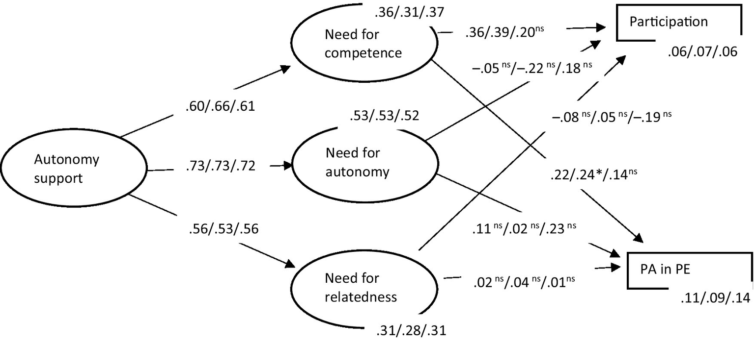 Structural equation model of autonomy support, basic psychological needs satisfaction, PE participation, and PA in PE with parameter values for total sample, boys, and girls. All paths significant p ≤ 0.01 except *p ≤ 0.05 and ns = not significant. Total effects (r2) are displayed. Covariances between variables were omitted for presentation clarity.