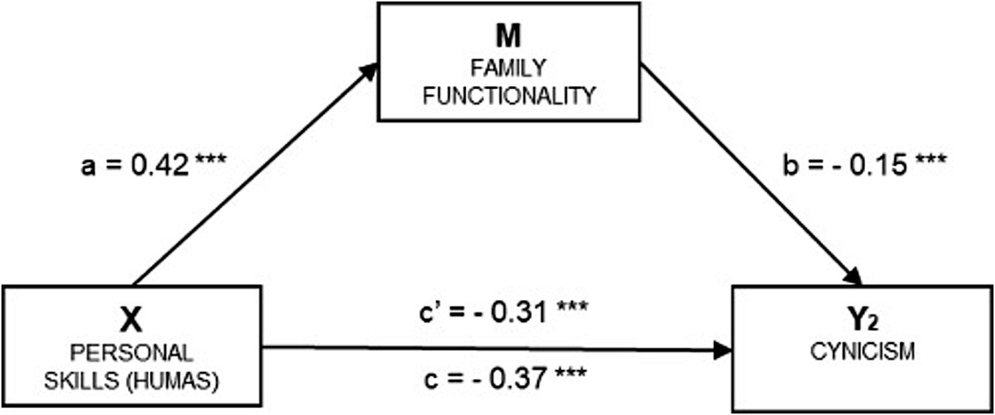 Family functionality has been identified as a mediator in various adolescent contexts, such as the relationship between prosocial behavior and school climate (González and Molero, 2023). However, there is a limited body of research that has specifically explored the mediating effect between personal competencies and academic burnout in depth, highlighting the need for further investigation in this area. Consequently, the main objectives of the present study are: (1) to analyze the relationships between humanization competencies, academic burnout, and family functioning in adolescents; (2) to explore potential sex differences in these variables; and (3) to examine the mediating role of family functioning in the relationship between humanization competencies and academic burnout.