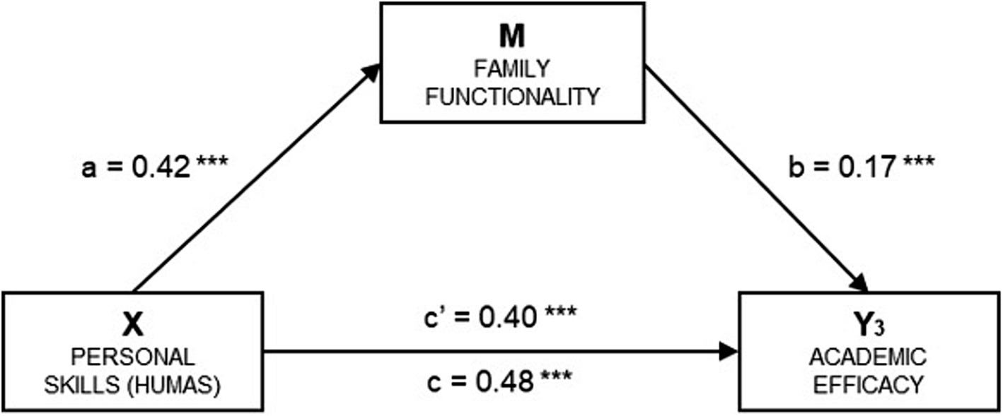 In the initial regression analysis, which is common across all three models, Family Functionality (M) was designated as the outcome variable, and the effect of the total score in Humanization competencies (X) was estimated, yielding a significant effect (β = 0.11, p < 0.001).