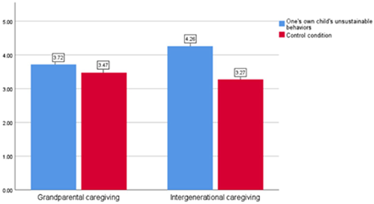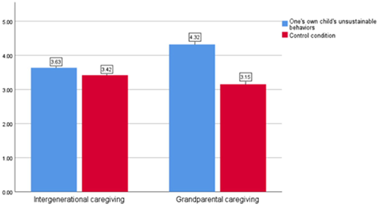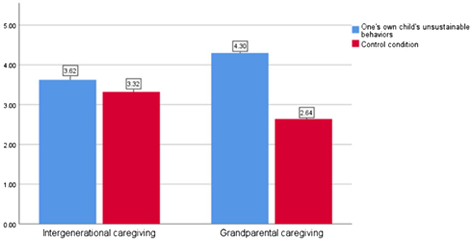 This experiment aimed to investigate the moderating effect of caregiver type on the relationship between children’s unsustainable behaviors and parents’ sustainable behaviors. Based on our hypothesis, we propose that compared to the baseline condition (i.e., not being exposed to their own child’s unsustainable behaviors), when children are raised in an intergenerational caregiving context, parents exposed to their own child’s unsustainable behaviors will exhibit stronger family responsibility and environmental responsibility, which, in turn, will enhance their intention to engage in sustainable behaviors.