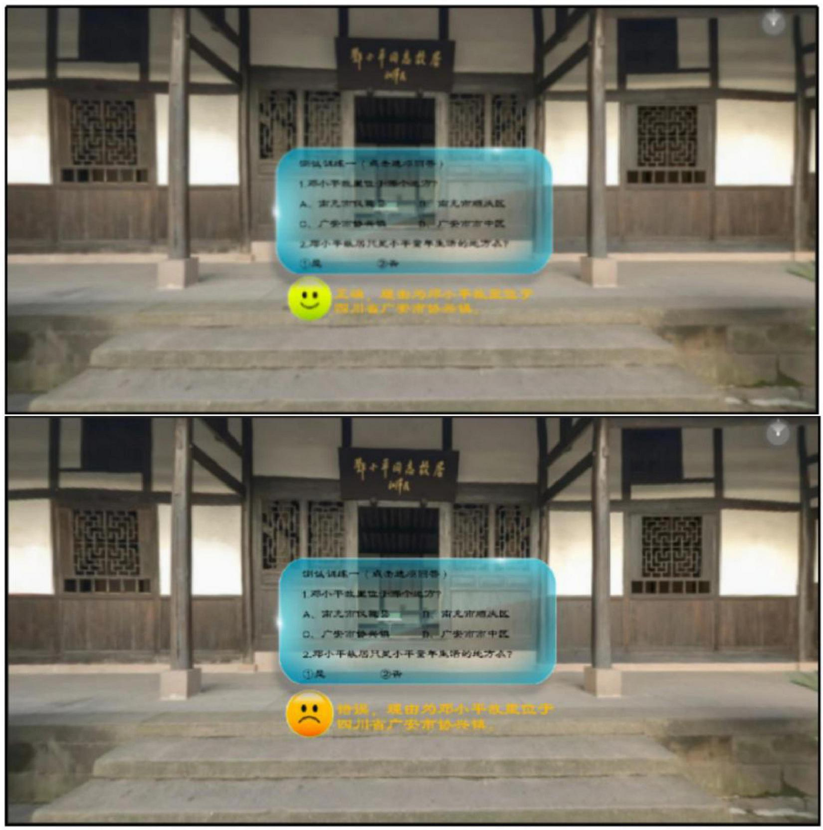The panoramic video resources embedded with question feedback in this study are mainly developed in Unity 3D, and the learning material is a video about “Deng Xiaoping, the Great Man,” which shows the site of Deng Xiaoping’s former residence and exhibition hall, briefly explains Deng Xiaoping’s biography and experiences, and then explains the main contents of Deng Xiaoping’s theory of socialism with Chinese characteristics, the development strategy of socialist construction, and the reform and opening-up. The panoramic video discussed in this study was viewed with an HMD, thus increasing the immersion of the learners during the learning process and enabling them to turn their heads 360° to view the entire world as in real life. The experimental materials consisted of three versions: a no-feedback version, a simple-feedback version, and an elaborated-feedback version. The study standardized the simple feedback phrases as “Great, correct answer!” or “Go for it, wrong answer!” and used consistently “Correct, the question is about the core knowledge and explanation” or “Wrong, the question is about the core knowledge and explanation” for elaborated feedback. The content of the narration in the panoramic video and the embedded questions and feedback are shown in Appendix Table 1. An example of simple question feedback embedded in question one is shown in Figure 1, and an example of elaborated question feedback is shown in Figure 2.