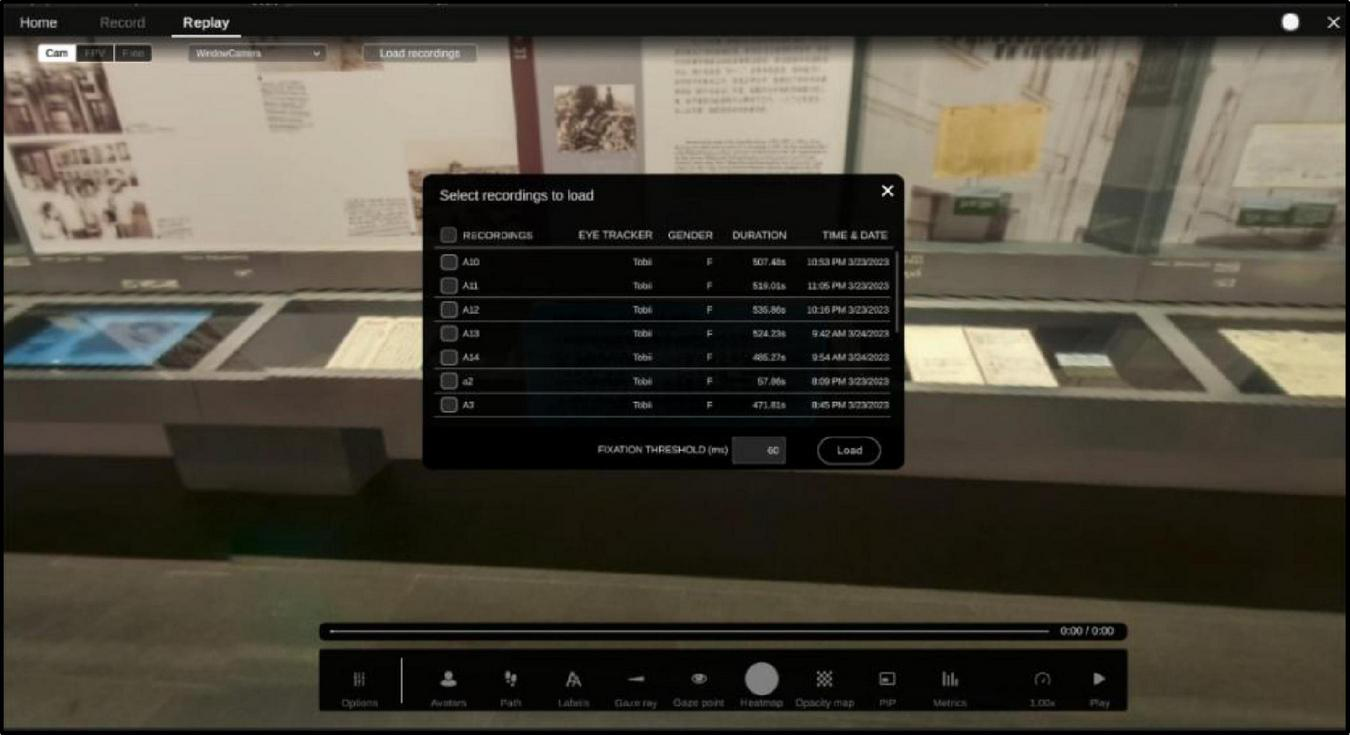 Finally, the eye movement data were exported after the experiment was completed. Enter the replay mode of Tobii Pro VR Analytics, select “Record” in the eye movement data export menu bar to bring up the eye movement data recording interface (Figure 4), check the experimental record, and then select “Record” in the eye movement data export control bar at the bottom of the page to export the data. Select “Record” in the eye movement data export menu bar to bring up the eye movement data recording interface.