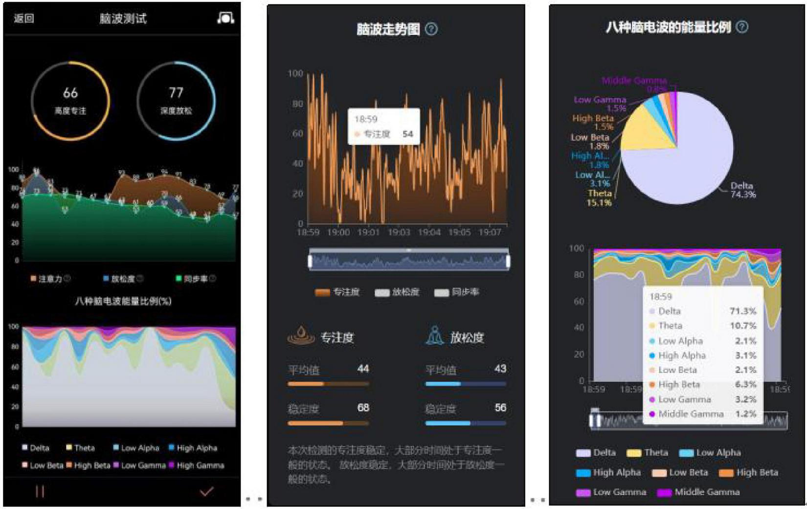 The brainwave data of this experiment are recorded and exported in the APP accompanying BrainLinkd, through which the trend of brainwave data and brainwave energy can be monitored in real time, Figure 5 is the trend of the brainwave after the completion of the data recording process, and the brainwave energy at a certain moment can also be viewed. Finally, select the brainwave data recording in APP to export and analyze the experimental data.