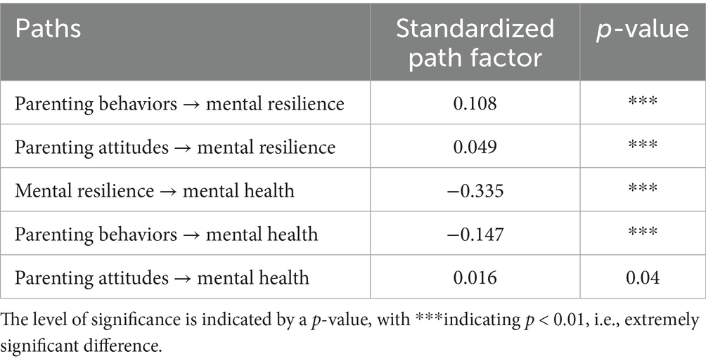 The standardized path coefficients and their significance tables reveal that the coefficient for the relationship between parenting attitudes within parenting styles and mental resilience has reached a significant level: parenting attitudes → mental resilience (β = 0.049, p < 0.001). Therefore, it can be concluded that the hypothesis that “parenting attitudes in parenting styles have a positive and significant influence on mental resilience” is therefore supported.