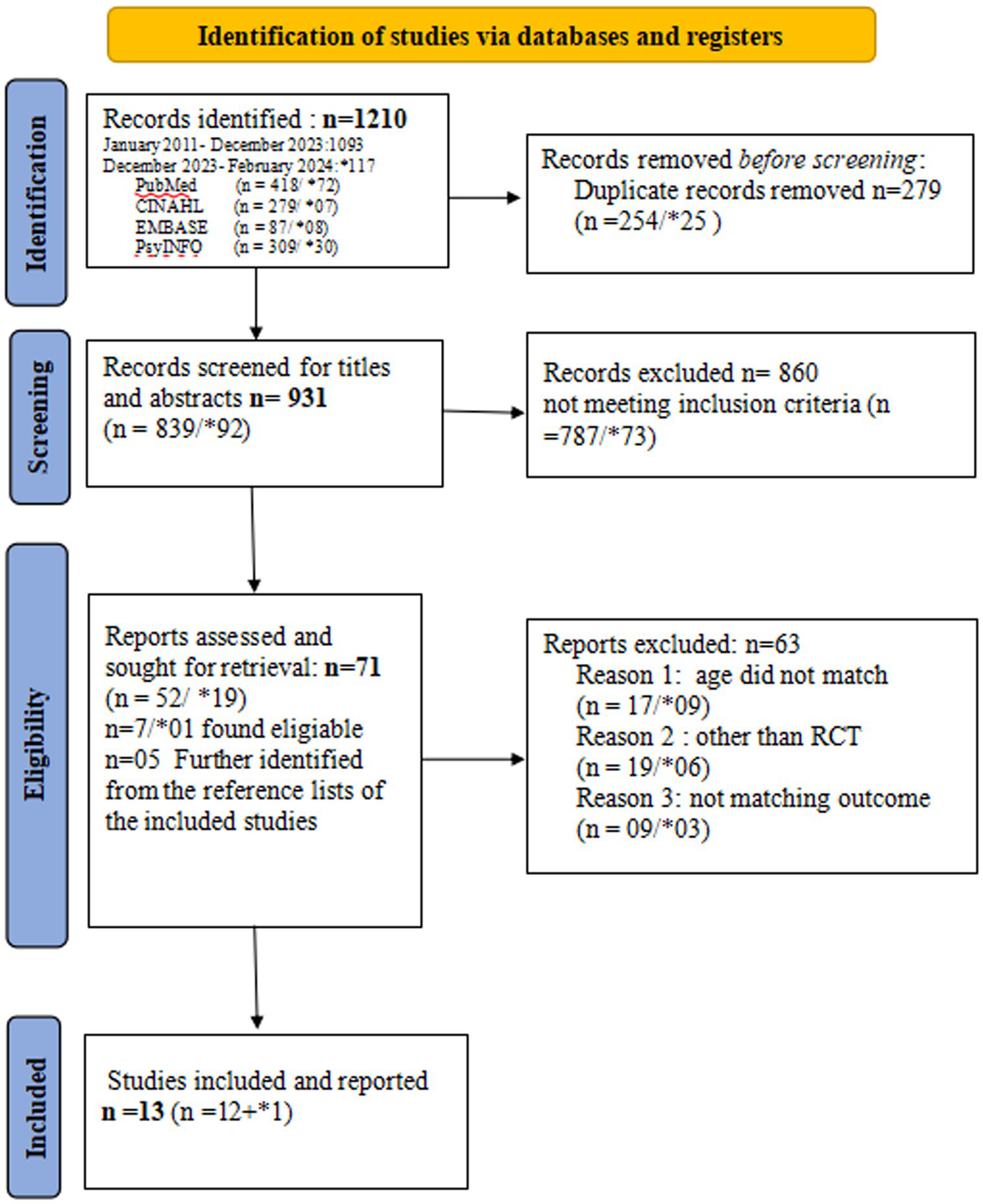 The review employed a systematic literature search strategy to identify relevant studies on mental health interventions aimed at reducing depression and suicidal tendencies in adolescents. The search encompassed databases including PubMed, CINAHL, Embase, and APA PsycINFO from 1 January 2011 to 15 December 2023 (n = 1,093). To update the review with recent literature, a revised search was conducted from 16 December 2023 to 23 February 2024, yielding 117 citations (Supplementary file 3). We selected 1 January 2011 as the starting point for our literature search to focus on the most recent evidence reflecting advancements. This date corresponds with a notable shift in the availability of high-quality RCTs identified during a preliminary review. Spanning a decade, this timeline facilitates a comprehensive analysis of contemporary evidence. Previous seminal reviews (Das et al., 2016; Fazel et al., 2014a; Fazel et al., 2014b) have addressed research prior to 2011. To prevent overlap and build on this existing knowledge base, we focused on newer studies while also reviewing the references of earlier works to include any crucial prior research. Figure 1 illustrates the updated search process, from database querying to the final inclusion of citations, as indicated by an asterisk in the PRISMA Flow diagram.