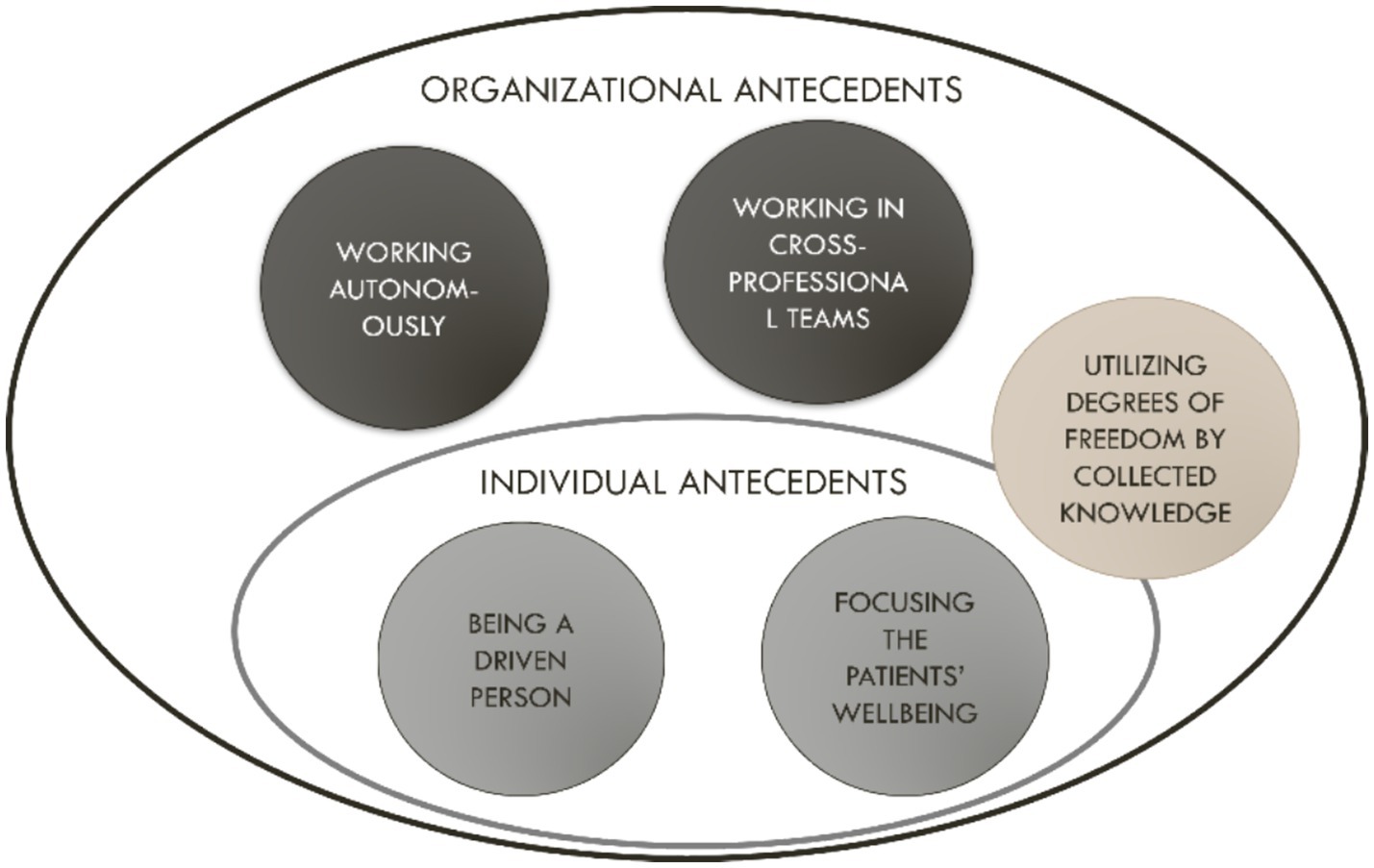 Antecedents of health-promoting job crafting among healthcare employees were identified on the individual level as well as in organizational structures. The most prominent antecedent for health-promoting job crafting among the employees in this study was that almost all of them considered themselves, or were interpreted, as driven people. Regardless of working in contexts with perceived support from colleagues and managers, or if work was mostly conducted on their own or in constraining work contexts, the employee respondents were adapting and changing work in a direction that promoted their well-being. Another individual antecedent was the employee respondents’ focus on the patient’s well-being: their intention to consider what was best for the patient was aligned with their crafting strategies, which increased the perceived meaningfulness in work. The third antecedent was being able to utilize degrees of freedom, which was gained through collected knowledge among the employees–for example, through experience, education, or from working in cross-disciplinary teams. Here, organizational-level conditions and structures were involved in enabling autonomy for health-promoting job crafting. The emerging antecedents are presented below and summarized in Figure 1.