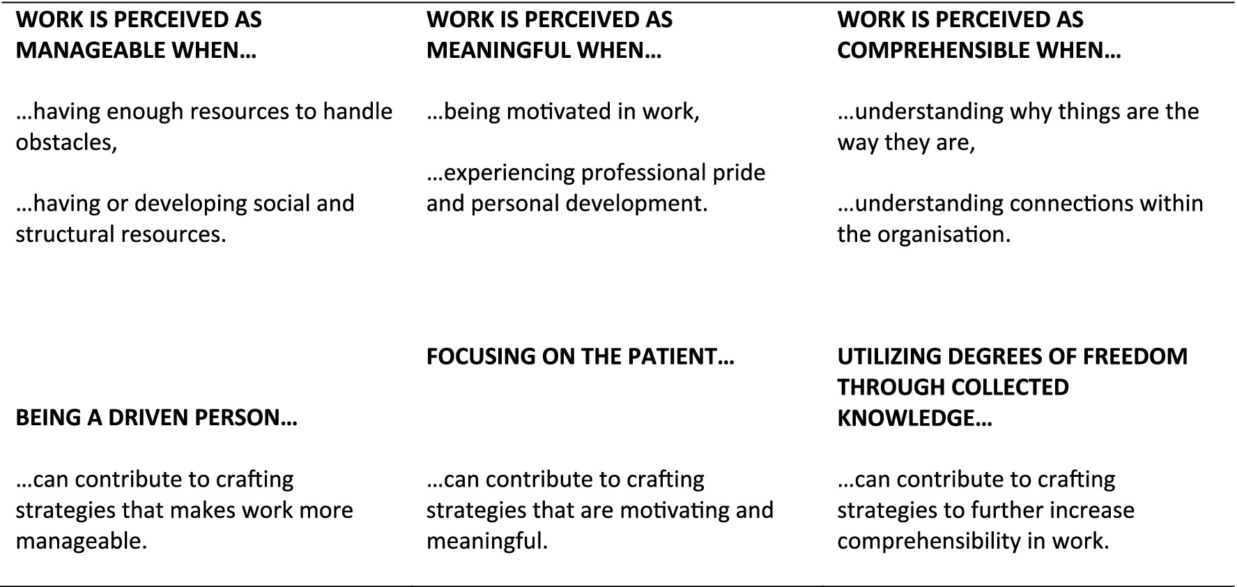 Figure 2. Proposed model of how the findings of antecedents for job crafting are related to a sense of coherence: Being a driven person as the basis for job crafting manageability in complex work; Focusing on the patient as the major antecedent to craft meaningfulness at work; and, Utilizing degrees of freedom as crucial for crafting comprehensibility at work.