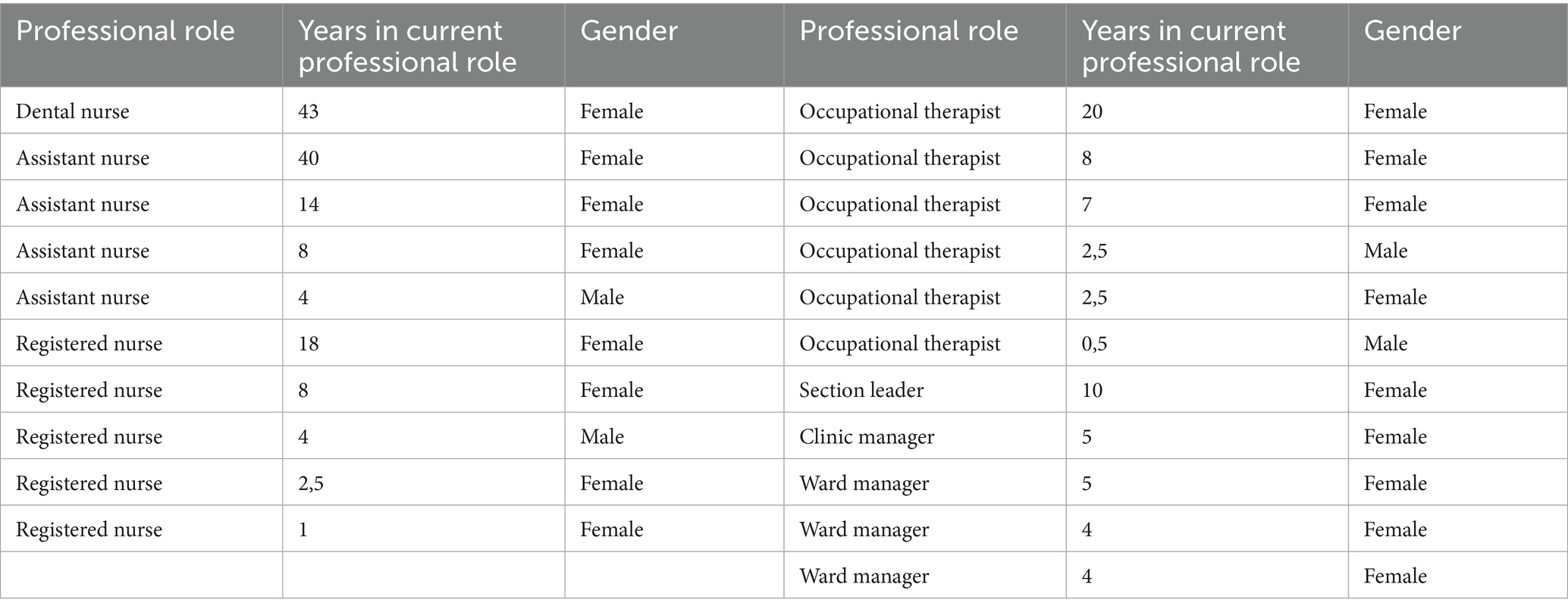 Clinic managers and ward managers were initially contacted with an invitation to participate in the research project. To provide empirical data from a range of professions and work experience as broad as possible, respondents from different professional groups, and with varying lengths of work experience, were thereafter requested to participate by those managers who accepted the invitation. Employees were contacted by their managers with an invitation to participate in the project sent either by e-mail or through personal contact. Participation was voluntary, albeit known to their closest manager. To broaden the sample and data material, managers were in some cases contacted with specific requests for employees from specific professional groups or lengths of work experience. This resulted in 21 informants, of which 16 were employees and five were managers: one dental nurse, four assistant nurses, five registered nurses, six occupational therapists, one section leader, one clinic manager, and three ward managers. Seventeen respondents were women and four were men, and the work experience in the current profession ranged from 6 months to 43 years. Among the managers, experience in managing positions ranged from 4 years to about 10 years (see Table 1).
