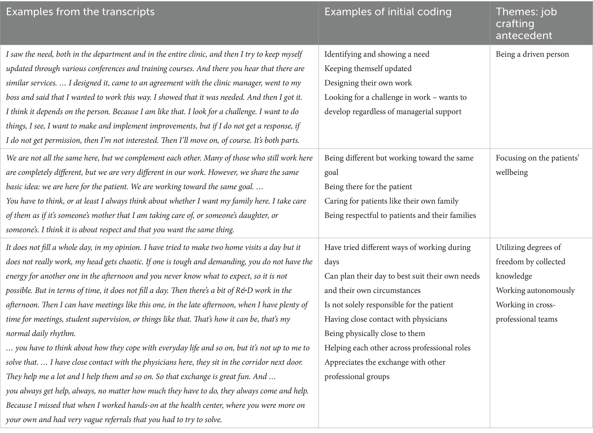 The employees described working in complex organizations, with limited control and oversight to see opportunities and have the freedom for job crafting. This meant that their crafting was enabled by the autonomy that was built by experience or in their profession, or by the shared knowledge and created freedom that was built in well-functioning cross-professional teams. Thus, utilizing degrees of freedom in work through collected knowledge and comprehensiveness was an antecedent for their job crafting strategies. With autonomy and organized cross-professional teams came an ‘organizational mandate’ to craft at individual- and team levels. When utilizing perceived degrees of freedom, employee respondents saw opportunities to craft for professional development, as well as to manage challenges in better ways. For example, the employees sometimes asked for responsibilities outside their occupational roles and planned to meet their patients together with other professionals. Those strategies were said to contribute to development within their profession.