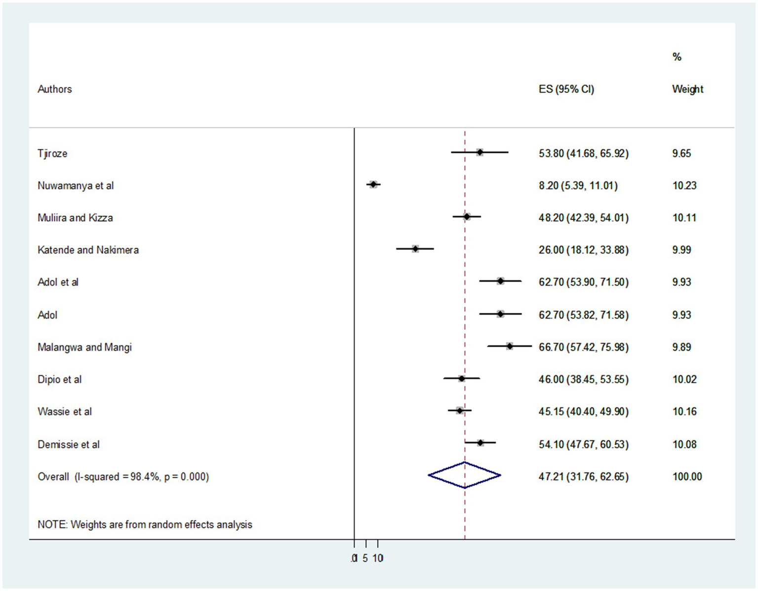 Methods: To find studies, we searched databases such as PubMed, Scopus, Cochrane Library, Science Direct, African Journal Online, and Google Scholar. A Microsoft Excel spreadsheet was used to extract the data, which were then transferred to STATA version 14 for analysis. The statistical heterogeneity was evaluated by using Cochran’s Q and I2 statistics. To identify publication bias, Egger regression tests and funnel plot analysis were used. Sensitivity and subgroup analyses were carried out.