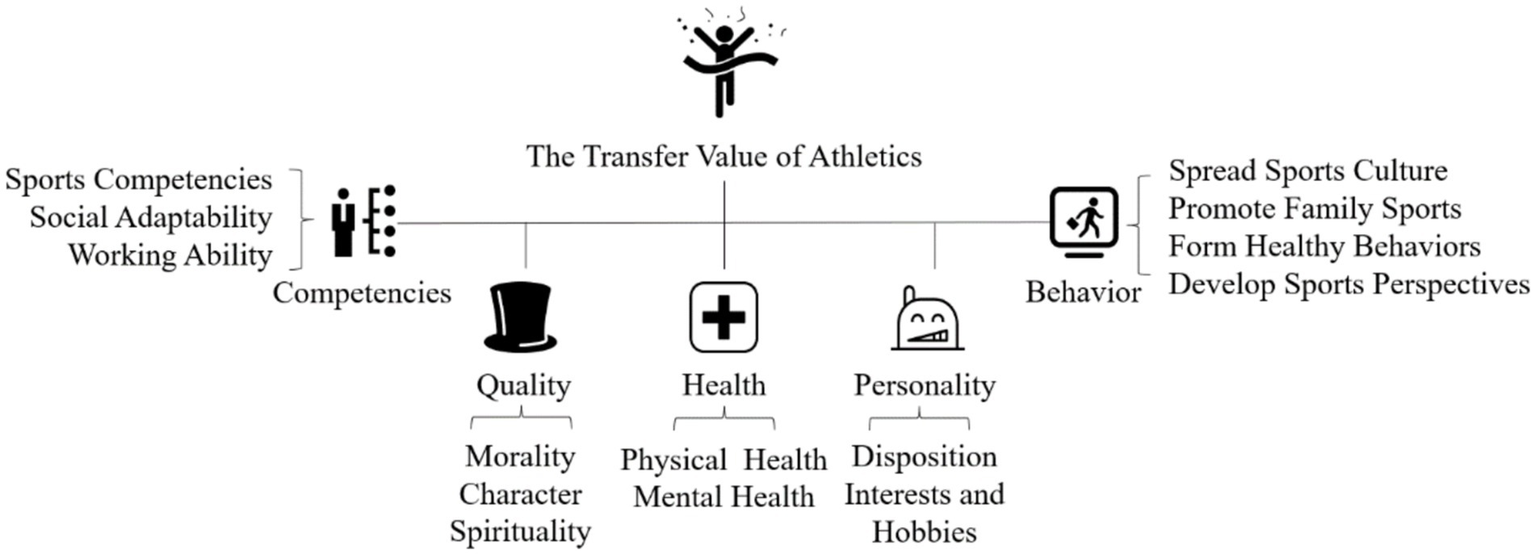 As part of the last stage of education, university sports impact all aspects of students’ lives. However, while the value of athletics is not confined to the field, sports researchers have mostly focused on the educational value of athletics, and there is no comprehensive framework for the transfer value of athletics (TVA). As Tsinghua University is considered the flagship of Chinese university sports, this research aims to develop a comprehensive TVA framework by analyzing the memoirs of graduates from Tsinghua in “Tsinghua Sports Influenced My Life” using grounded theory technical approach. In the memoirs, most of the graduates mentioned that the educational value of sports had been transferred into their lives. The findings also demonstrate that the TVA framework consists of five dimensions: competencies, quality, health, personality, and behavior. Analyzing the TVA framework demonstrates that there are three steps for generating TVA: Students participate and enjoy sports, they develop physical literacy, and then transfer the physical literacy into their lives. The memoirs also demonstrate that the formation mechanisms of the TVA include: (1) School sports culture that enables students to establish a positive view of athletics; (2) sports clubs and competition systems that develop students’ physical literacy; and (3) physical educators and legitimate peripheral participation in the community that transfers physical literacy to daily life. This study reveals the value of university sports to students’ lives and provides guidance for universities to develop well-rounded individuals through sports.