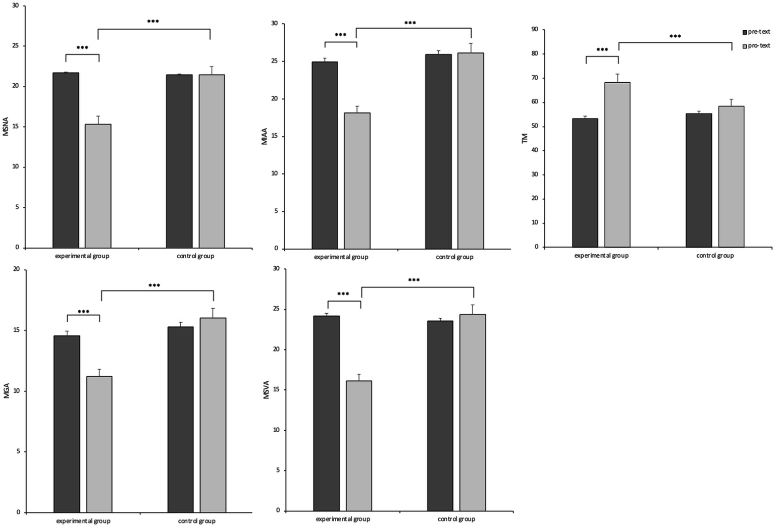 To test the effectiveness of the brief online MBI, 2 (group: experimental group vs. control group) × 2 (time: pre-test vs. post-test) two-factor repeated measures analysis of variance was conducted with MSNA, MGA, MIAA, MSVA, and TM.