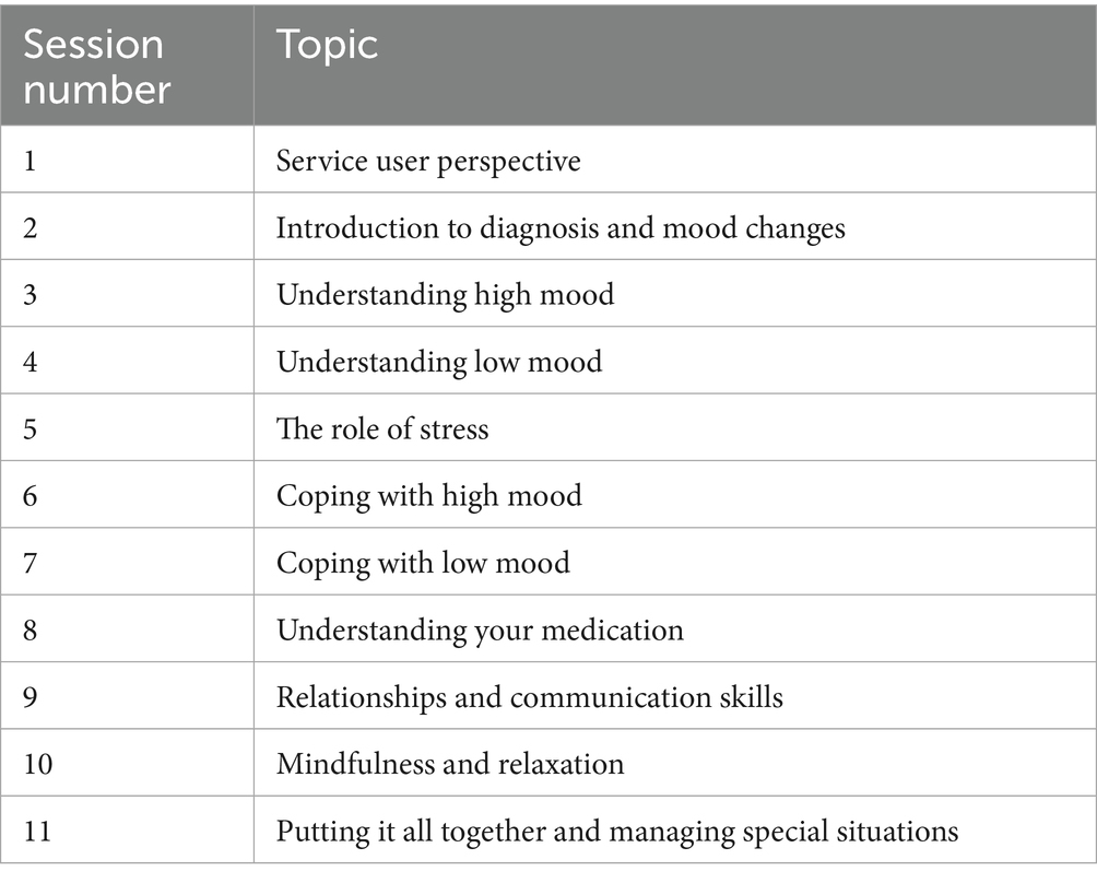 The current study focusses on the group CBT element of the programme. This covers themes such as understanding low and high mood, relaxation, and relationships (see Table 1) and is in line with NICE recommended psychological intervention for this client group (National Institute for Health and Care Excellence, 2014).
