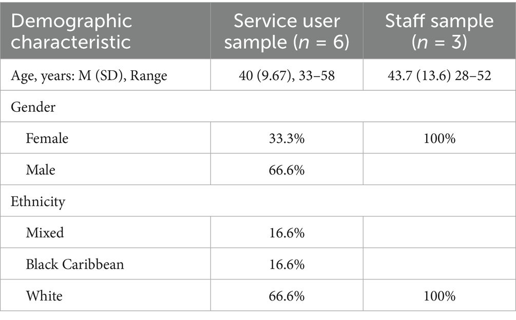 Each interview/focus group was recorded and verbal consent to record was taken at the beginning. Consent was also documented on each service users’ patient record. Participants were informed that they could withdraw at any point and that this would not affect their care and that all data collected would remain confidential and anonymous.