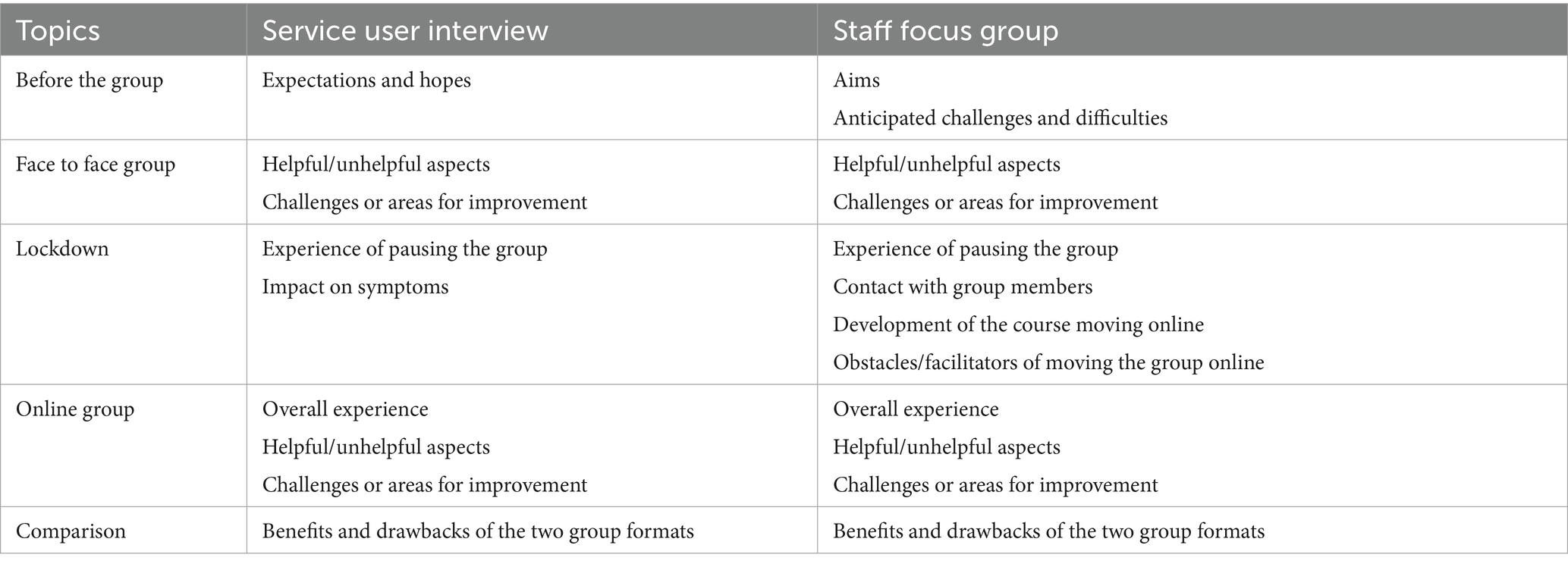 Table 4. Table comparing topics discussed in both service user interviews, and the staff focus group.