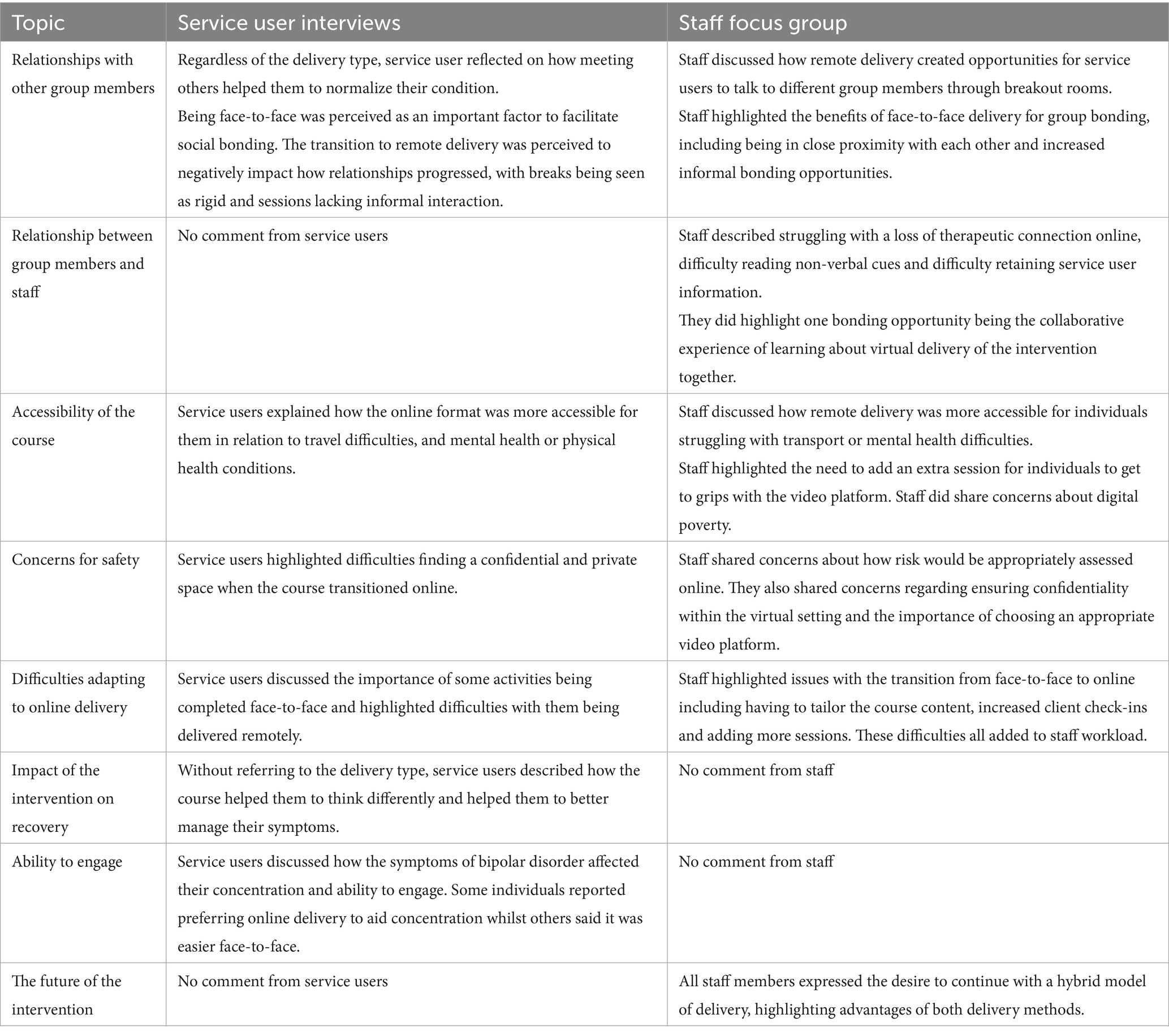 Finally, this was an opportunistic evaluation presented at an uncertain time in mental health services. Whilst it provided us with a unique opportunity of exploring the change in group delivery format from the same service users and staff’s perspectives, it could be argued it is limited in its scope given the unique set of circumstances at the time of the evaluation. Although the findings from this qualitative study are rich and informative, it is also important to consider quantitative outcomes. Future mixed-method research should explore the effectiveness of online group interventions for bipolar disorder which includes quantitative outcomes measures, for example exploring changes in mental health, recovery and quality of life. It would also be beneficial to compare how outcomes (such as mental health, recovery) differ between delivery types.