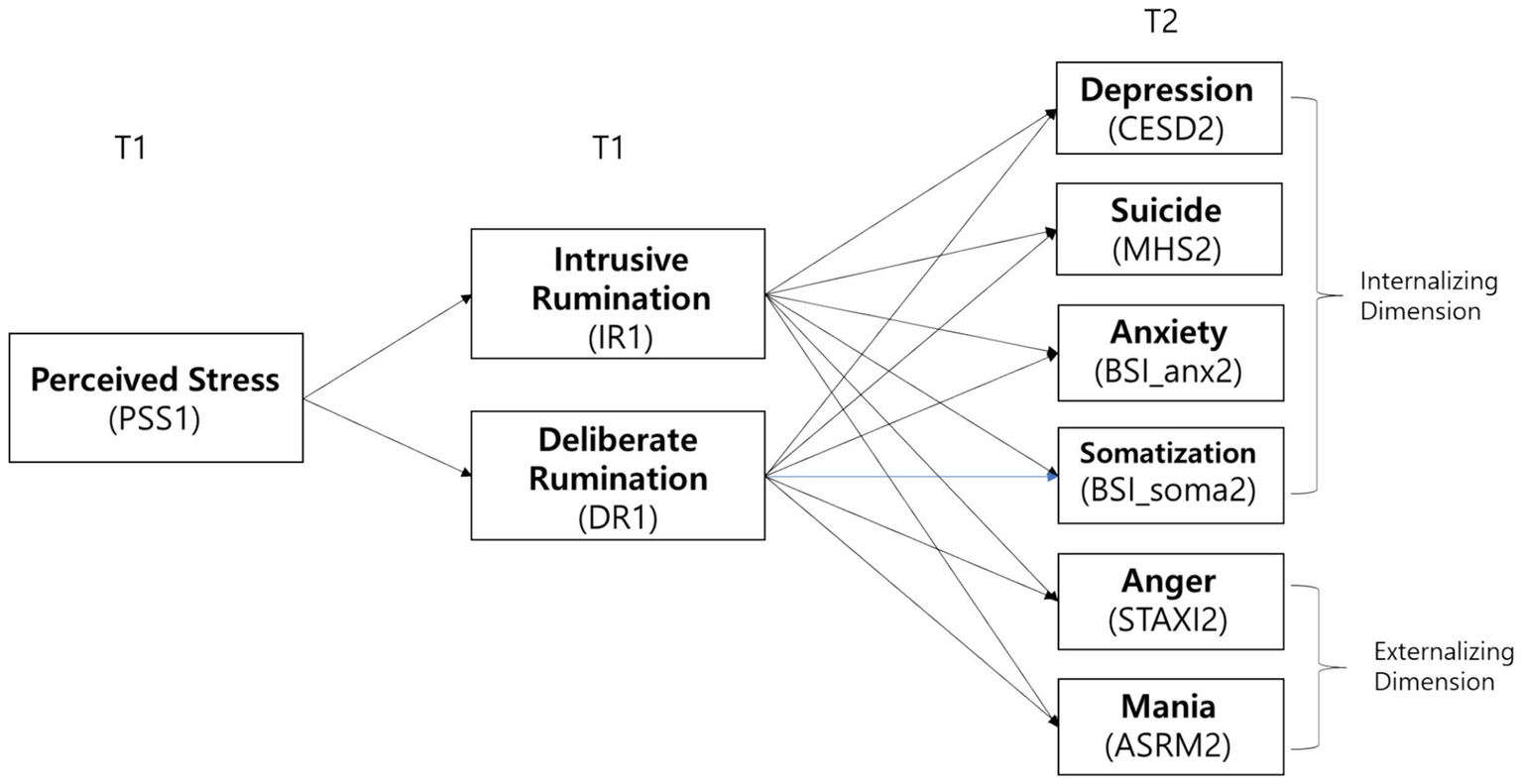Therefore, this study attempted to longitudinally explore the mediating pathways of event-related ruminations between perceived stress and both internalizing and externalizing psychopathology, utilizing two-wave data collected during the recent pandemic. Based on the more consistent association between IR and psychiatric symptoms, we expected IR to be a transdiagnostic mediator between perceived stress and both internalizing and externalizing psychopathologies. Given that the role of DR in preventing or mitigating negative outcomes has been relatively weak in prior research (Kang and Kim, 2021; Squires et al., 2022), we anticipated that the mediating role of DR would be less transdiagnostic than that of IR.