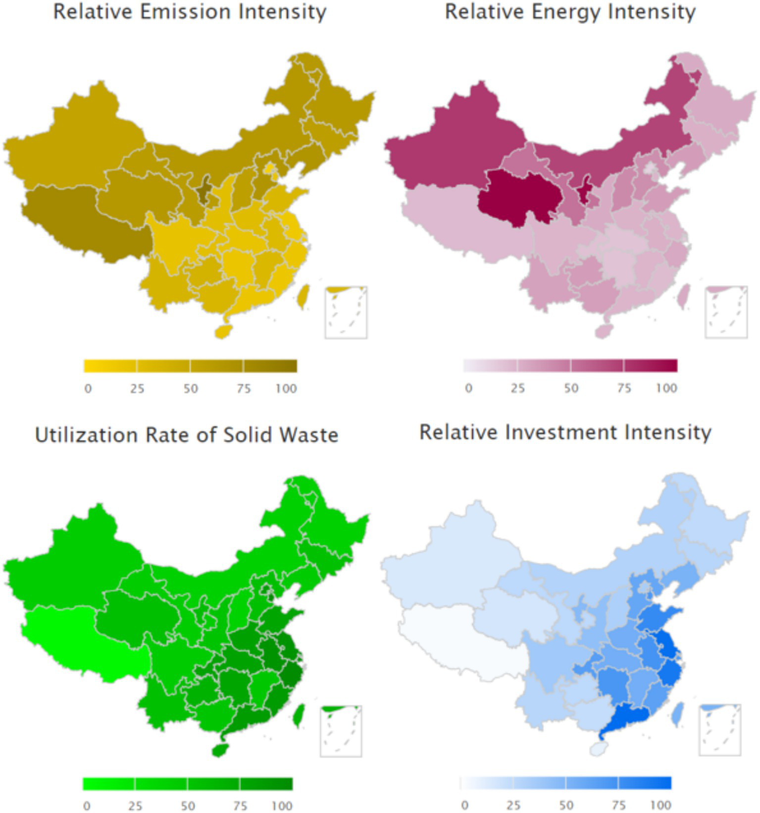 Academic Literature Shows Humanity is encountering severe ecological challenges in recent decades, including the greenhouse effect (Parmesan and Yohe, 2003), biodiversity reduction (Cardinale et al., 2012), and depletion of natural resources (Lotze et al., 2006). To achieve a sustainable balance between economic growth, social progress, and environmental protection, many governments have implemented green development initiatives (Rosen et al., 2008). Some companies also aim to execute environmentally friendly business practices, such as reducing emissions, enhancing resource efficiency, utilizing purification technology, and promoting circular production, in both advanced and emerging economies (Chiou et al., 2011; Cuerva et al., 2014; Gupta and Barua, 2018; Fernando et al., 2019). In addition, there are producers who are actively exploring key elements of sustainable manufacturing practices and sustainable development strategies (Koppiahraj et al., 2023). As a globally important manufacturing base, the indicators of energy consumption, emissions, waste recycling and investment in innovative activities in the production of Chinese enterprises show us how serious the ecological situation facing mankind is and how strong the determination to pursue green development is (see Figure 1). The upper two panels of Figure 1 illustrate the pressure levels of energy consumption and pollutant emissions across provincial-level administrative regions in 2022, with darker shading indicating higher pressure intensity. The lower two panels depict regional efforts in waste utilization and innovation investment, where darker coloration represents superior performance.1 This is like the ecological and employee health impacts of the mining industry in India (Marimuthu et al., 2023). There are many barriers to the implementation of green production in manufacturing in developing countries, as evidenced in Ponnambalam et al.’s (2023) study.