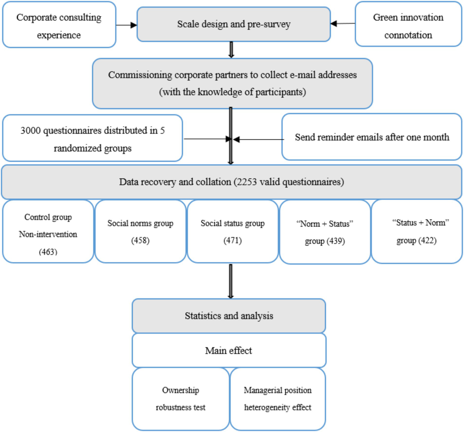 Prior to contacting interviewees, we conservatively calculated the minimum sample size to meet the research requirements according to G*Power 3 and 3.1 (Faul et al., 2007, 2009). In general, the effect size related to behavioral intervention research is small (Cohen’s d < 0.2, or 0.2 < d < 0.5), we used d = 0.2 as well as 5 percent level (two-sided) and 0.8 power level as the calculation basis. For each group of our study, we needed at least 394 samples, or a total of 1,970 valid questionnaires. To ensure an adequate sample size, we intended to administer 3,000 questionnaires, a process that required logistical support from the university’s alumni network. We selected 851 manufacturing firms from the alumni enterprise database, assigned each a unique identifier, and randomly chose 300 for our study. Two of the paper’s authors conducted individual phone calls with the alumni representatives of these 300 firms, explaining the purpose of the experiment and requesting each alumnus to provide 10 employee email addresses from their respective companies. The email addresses collected were then grouped based on the alphabetical order of their initials, with each group allocating 600 questionnaires. Employees from the same firm were randomly distributed across different groups to ensure randomization. This approach also helped mitigate potential interference from participants’ demographic characteristics on the experimental outcomes. The survey was conducted between October and December 2022, during which we sent a questionnaire along with a thank-you letter to each email address. One month after the survey invitation, we sent another email to remind the respondents. To ensure respondents’ informational privacy, all survey responses were directly submitted to the corresponding author without intermediary transmission (e.g., via email collectors). Consequently, no individuals other than the research team had access to completed questionnaires, while respondents’ identities remained anonymized throughout the study. Furthermore, this research strictly adhered to ethical guidelines by: (I) maintaining full transparency in all research communications, (II) avoiding categorical labeling of participants, and (III) preserving complete behavioral autonomy. In the end, we took back 2,253 questionnaires (75.10% effective response rate), which included 463 questionnaires of control group (77.17% effective response rate), 458 questionnaires of social norm group (76.33% effective response rate), 471 questionnaires of social status group (78.50% effective response rate), 439 questionnaires of “Norm + Status” group (73.17% effective response rate), and 422 questionnaires of “Status + Norm” group (70.33% effective response rate), respectively. State-owned enterprises respondents are 1,051, 46.65 percent proportion, and managers respondents are 1,119, 49.67 percent proportion.