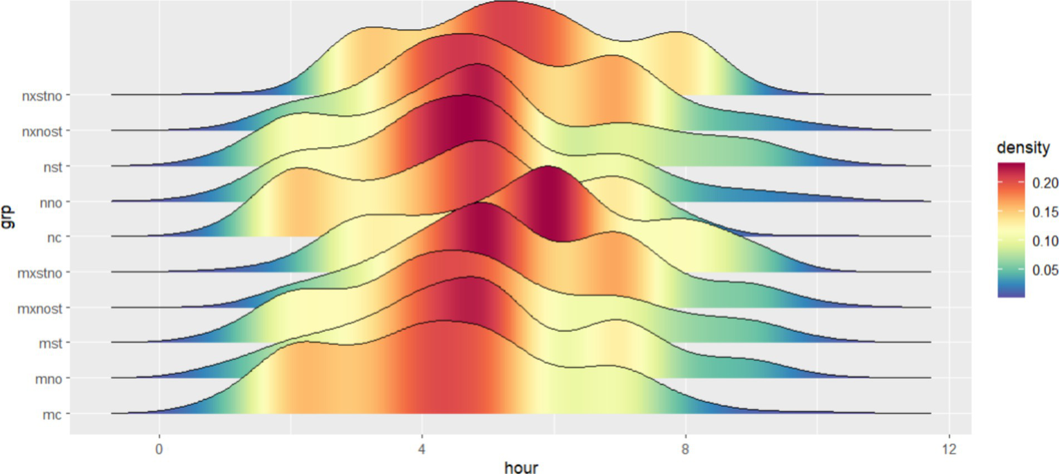 On average, the initial level of managers is lower than that of non-managers. However, managers’ level was increased more significantly by social norm stimuli, combined treatment of “Norm + Status” and “Status + Norm,” not including the social status group. Figure 6 shows the effectiveness of the different boosting schemes in a peak-to-peak diagram, where the red peaks represent the areas with the highest concentration of data.