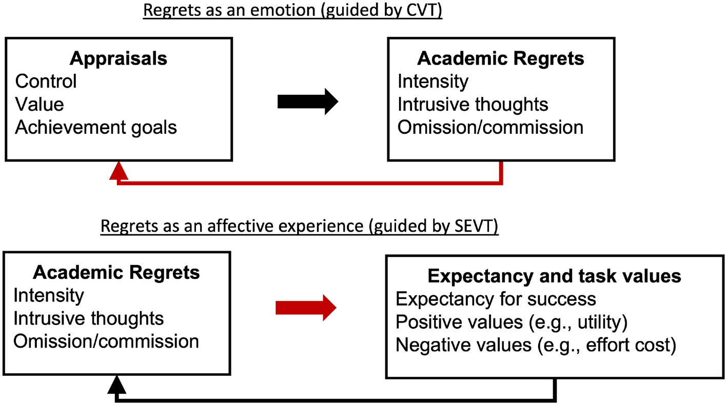 CVT provides a framework for understanding antecedents and outcomes of emotions within achievement contexts (Pekrun, 2006, 2018, 2021). This theory proposes that environmental factors such as instructional quality predict students' perceptions of control and value, which in turn predict emotions. Subsequently, emotions predict learning and achievement outcomes. Furthermore, reciprocal paths are proposed which link antecedents, emotions, and outcomes in a cyclical pattern of causation (e.g., Pekrun et al., 2014, 2017). Regrets could be conceptualized within CVT as retrospective outcome-related emotions because they are experienced based on a post-hoc (i.e., retrospective) appraisal of a specific event or experience (i.e., an outcome) and could be considered a retrospective negative-activated or negative-deactivated outcome emotion.