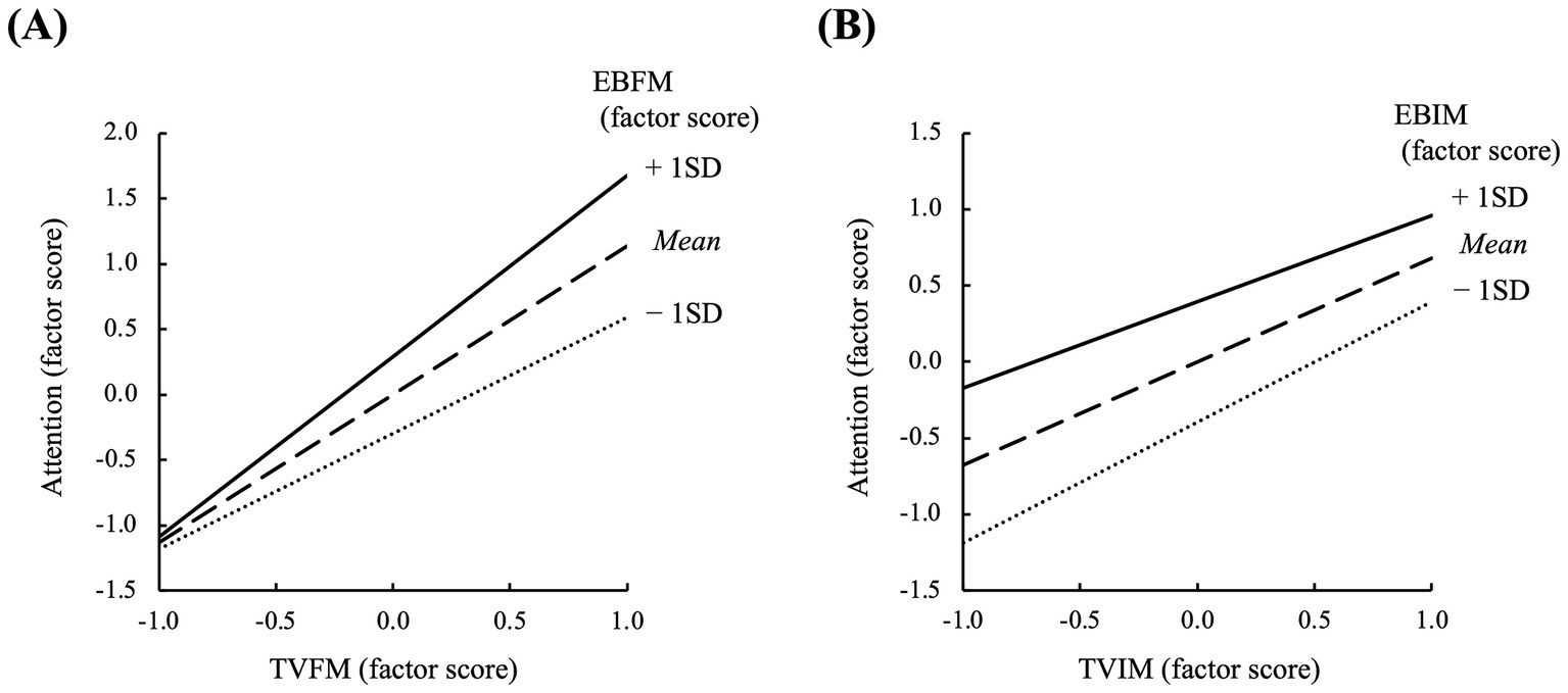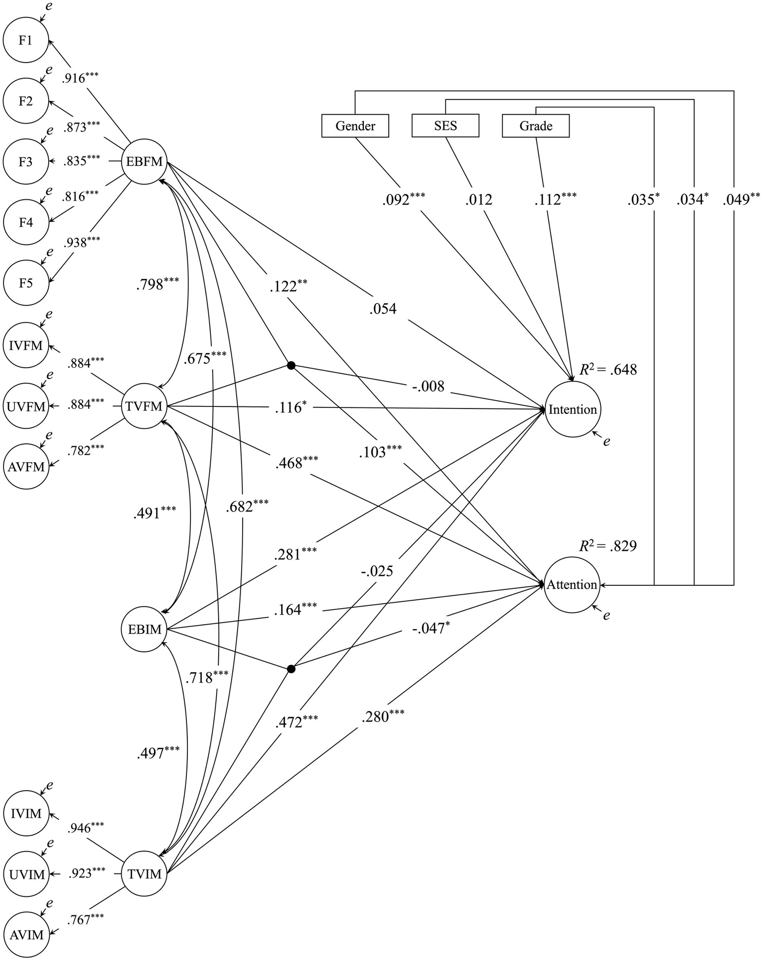 Subsequently, we addressed the primary RQ: “Can MFM explain students’ music listening behaviors in everyday life even after statistically controlling for MIM?” (Analysis 2). Here, music-listening behavior encompasses two aspects: the intention to access music in daily life (hereafter, intention) and attention to musical elements during everyday music listening (hereafter, attention). In this study, motivation is conceptualized as four factors arising from two components (expectancy belief and task value) across two contexts (MFM and MIM), forming a 2 × 2 factorial structure. The model estimated in this research is a regression model in which the main effects of the four factors (latent variables) and the two interaction terms (expectancy belief × task value for MFM and MIM, respectively) serve as the independent variables, with the two music-listening behaviors as the dependent variables.