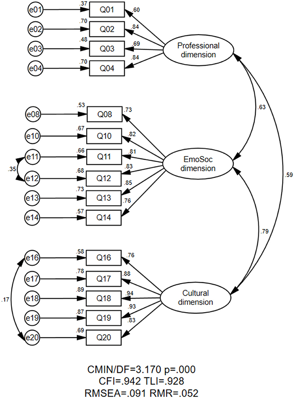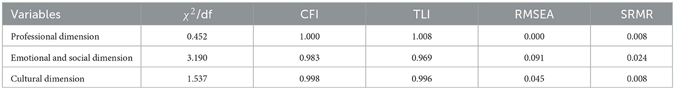 In adapting this scale, we have thoroughly considered the specific educational environment of EFL vocational teachers and the pressures and challenges they encounter. Data analysis confirmed that the EFL vocational school teacher resilience exhibited a tri-dimensional construct. Compared with previous studies on scale development and validation based on Mansfield and Wosnitza (2015), such as Peixoto et al. (2020), Chen and Lee (2022), and Liu et al. (2024), this study retained the professional dimension (Chen and Lee, 2022; Liu et al., 2024; Mansfield and Wosnitza, 2015; Peixoto et al., 2020) and cultural dimension (Liu et al., 2024), while integrating the emotional and social dimensions into one dimension. These differences manifested in the unique working environments of EFL vocational schools and the distinct characteristics of EFL vocational school teacher resilience. Therefore, this study provided a reliable instrument for measuring EFL vocational school teacher resilience.