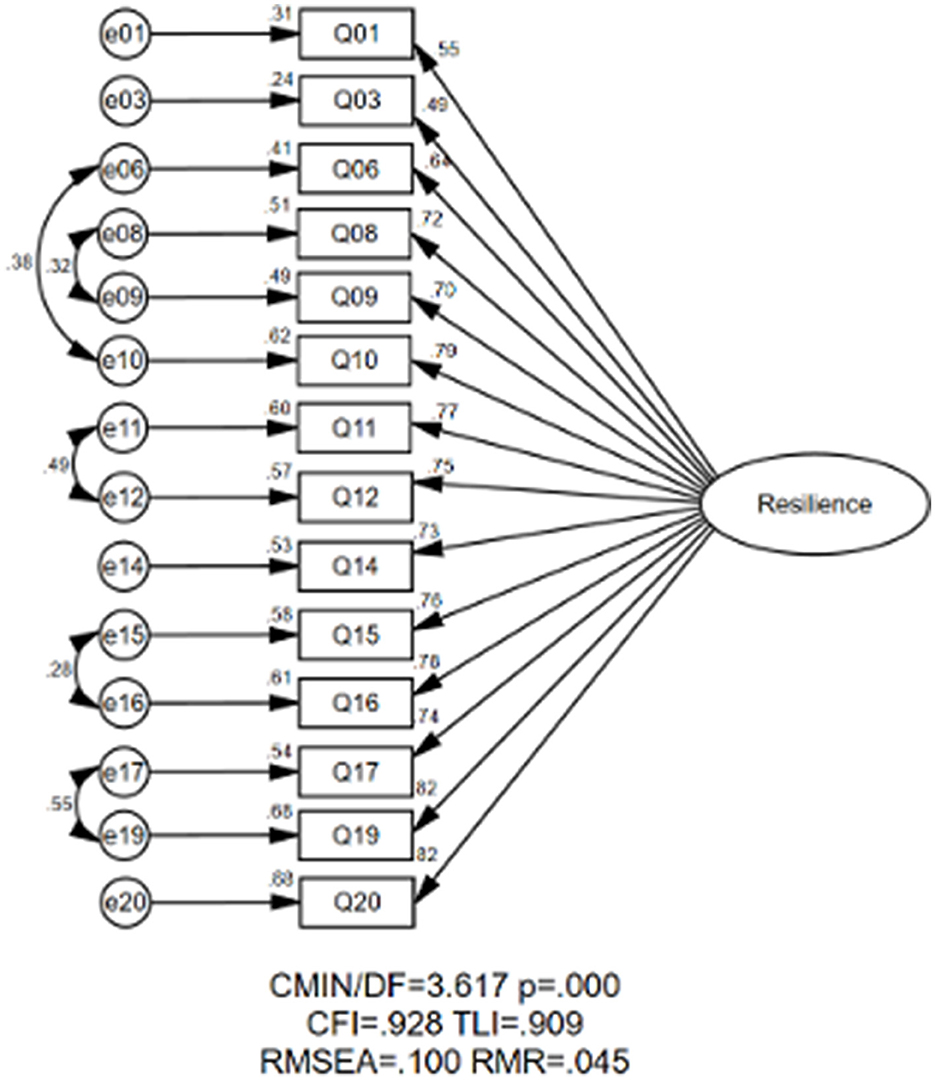 In addition, we also evaluated the one-factorial structure of EFL vocational school teacher resilience. The initial CFA results indicated unsatisfactory model fit indices for this structure. As Figure 2 illustrates, the modified one-factorial structure exhibited poorer model fit indices compared to the tri-factorial structure: RMSEA = 0.100, SRMR = 0.053, CFI = 0.928, TLI = 0.909. Considering both the theoretical framework and statistical analysis, the tri-factorial structure was chosen as the final measurement model.