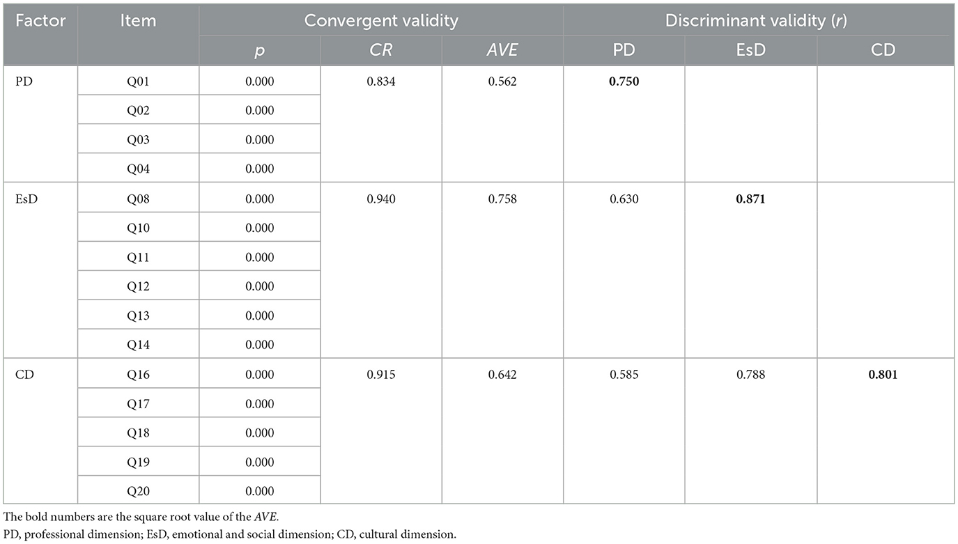 The analysis commenced with a test for univariate normality to assess the distribution of the collected data. The results, detailed in the Supplementary material, indicated that skewness values ranged from −1.723 to −0.757 and kurtosis values from −0.558 to 3.834, which fell within the benchmarks of |2.0| and |7.0|, respectively, suggesting a normal distribution of the data (Finney and DiStefano, 2006; West et al., 1995). Subsequently, item analysis was conducted to evaluate the discriminant validity of each item on the scale (Field, 2013). The top and bottom 27% of EFL teachers, based on their scores on the adapted 20-item EFL vocational school teacher resilience scale, were selected and compared using an independent samples t-test. The results of the independent samples t-test revealed significant differences between these two groups for each item (p < 0.001), confirming the appropriateness of all items for further analysis. Additionally, item-total correlation analysis was performed to examine the relationship between each item and the overall scale. The correlation coefficients were between 0.594 and 0.833, higher than the threshold of 0.30 (p < 0.001; Field, 2013). The detailed results of the independent samples t-test and item-total correlation analysis were available in the Supplementary material.