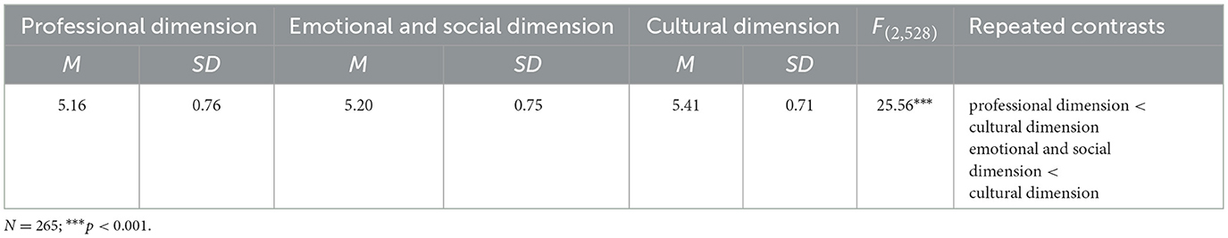 We also explored the levels of EFL vocational school teacher resilience, with results presented in Table 3. The EFL vocational school teachers reported a high level of overall resilience (M = 5.26, SD = 0.65). The result was consistent with prior research reporting a high level of EFL teacher resilience (Liu, 2024b). The EFL vocational school teachers also reported high levels of the cultural dimension (M = 5.41, SD = 0.71), emotional and social dimension (M = 5.20, SD = 0.75), and professional dimension (M = 5.16, SD = 0.76). There was significant difference between cultural dimension and professional dimension, and between cultural dimension and emotional and social dimension. No significant difference was observed between professional dimension and emotional and social dimension.