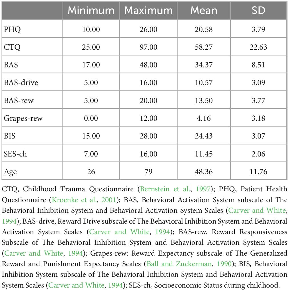 We evaluated CA with The Childhood Trauma Questionnaire (CTQ; Bernstein et al., 1997). Such retrospective measures are particularly useful in research on psychopathology as they capture the subjective nature of CA (Baldwin et al., 2024). Indeed, this scale has been previously used in research investigating CA and depression (Humphreys et al., 2020). The CTQ evaluates experiences of abuse and neglect, yet these experiences usually co-occur (Smith and Pollak, 2021). Hence, we computed an overall CA score. The CTQ has good reliability and validity (Bernstein et al., 1997; Georgieva et al., 2021) and it displayed good internal consistency in this study (Cronbach’s α = 0.93).