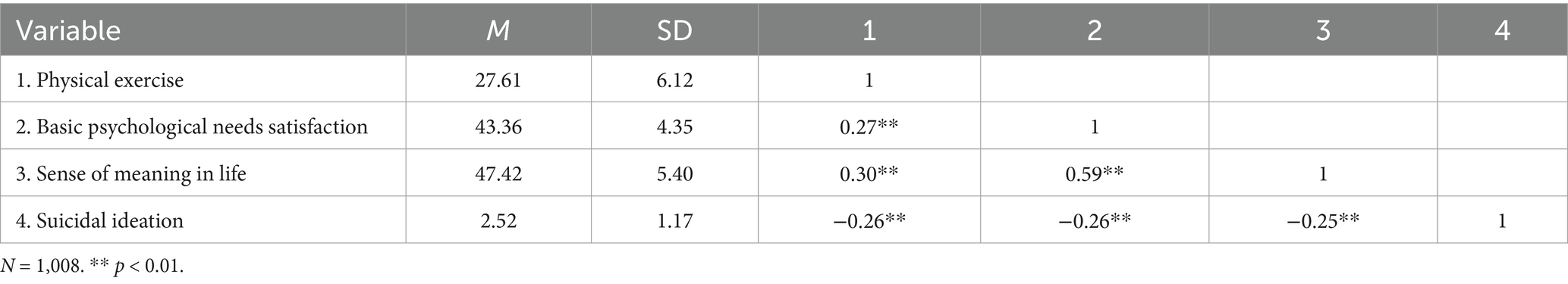 Methods: A stratified cluster random sampling method was adopted to survey 1,008 college students of Zhaoqing University from January 17th to 27th, 2024. The Physical Exercise Scale, Suicidal Ideation Scale, Basic Psychological Needs Satisfaction Scale, and Life Meaning Scale were used to assess physical exercise, suicidal ideation, basic psychological needs satisfaction, and sense of meaning in life, respectively. Data were statistically analyzed using descriptive statistics, correlation analysis, regression analysis, and mediation analysis using SPSS (IBM Corp.).