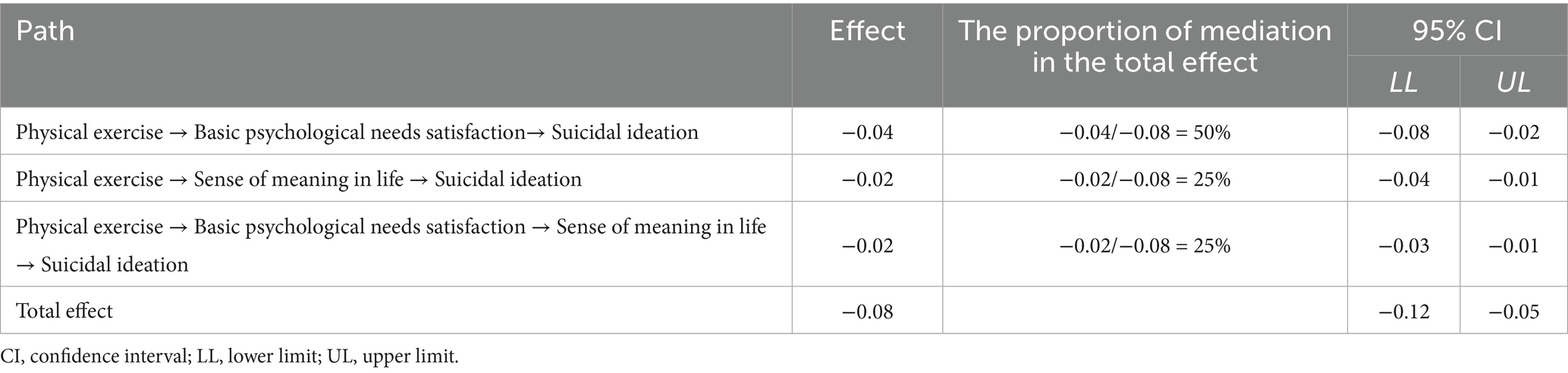 Results: Physical exercise was negatively associated with suicidal ideation (r = −0.26, p < 0.01). A significant direct effect was observed between physical exercise and suicidal ideation (β = −0.17, p < 0.01, 95% CI [−0.24, −0.11]). Physical exercise positively predicted both basic psychological needs satisfaction (β = 0.27, p < 0.01, 95% CI [0.20, 0.32]) and sense of life meaning (β = 0.17, p < 0.01, 95% CI [0.11, 0.22]). Both basic psychological needs satisfaction (β = −0.17, p < 0.01, 95% CI [−0.24, −0.10]) and sense of meaning in life (β = −0.12, p < 0.01, 95% CI [−0.20, −0.05]) were negatively associated with suicidal ideation. Additionally, basic psychological needs satisfaction was positively associated with sense of meaning in life (β = 0.53, p < 0.01, 95% CI [0.48, 0.58]). Mediation analysis revealed that both basic psychological needs satisfaction and sense of meaning in life significantly mediated the relationship between physical exercise and suicidal ideation. The mediating effect consists of three paths: the independent mediation effect of basic psychological needs satisfaction (effect value is −0.04), the independent mediation effect of sense of meaning in life (effect value is −0.02), and the chain mediation effect of basic psychological needs satisfaction and sense of meaning in life (effect value is −0.02).