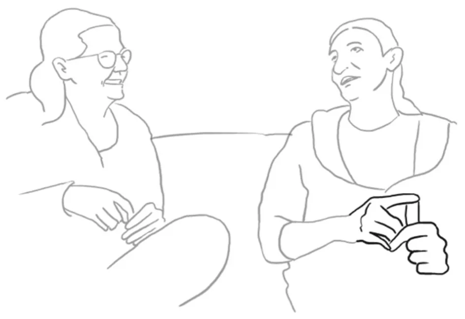 The crucial importance of the moment-by-moment unfolding of emergent utterance in the real time of interaction has been proven over and over in Conversation Analysis and Interactional Linguistics (Couper-Kuhlen and Selting, 2018). More recently, it has become clear that the bodily expressive movements are equally sensitive to the dialogic temporality (Deppermann and Streeck, 2018). However, the temporality of bodily expressions differs in at least two ways from the temporal design of verbal utterances. First, bodily movements seem to be less bound to turn constructional units. They more often than not start before the verbal utterance and can continue or fade out afterwards. Bodily expression thus can both project or foreshadow verbal expressions that are about to come (Kaukomaa et al., 2014) and they can frame them after the utterance (cf. Pfänder, 2023). Second, the communicative function of bodily movements can be attributed to at least four different dimensions, namely intercorporeality, coordination, common ground, and co-semiosis (for a similar account of interactional dimensions, cf. Pfänder, 2023; and Meyer, 2014). Collaborative story-telling under scrutiny here extensively relies on expressive resources for displaying intercorporeality, a shared embodied experience (Tanaka, 2016) of the co-operative actions that unites speakers as they engage (Goodwin, 2018). This requires subtle dynamics of more often than not kinesically achieved (micro-sequential) coordination, ensuring that participants know when there is a good moment to take a turn (Deppermann and Schmidt, 2021). Successful interaction can unfold only if common ground is constantly being established (Clark and Brennan, 1991; Clark, 1996/2012), meaning that all participants share a similar understanding of what their counterpart is talking about and what they intend to convey. And last, not least, these collaborative story-tellings live by co-semiosis, i.e., the collaborative effort to develop the topic of conversation and to create sense together (Schmid, 2020).