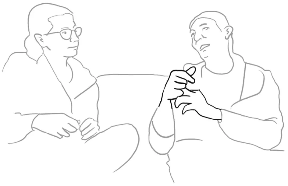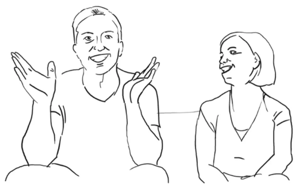 Thus, it is only through a multimodal analysis of stance and counter stance (epistemic and affective-evaluative) that we see that this is not a disruptive moment in a couple telling their love story, but rather a humorous form by integrating his cycling gesture with her uncertainty movement in one complex gesture trajectory. As we advocate the view that language is inherently multimodal and thus consider utterances to be of composite nature (Enfield, 2013), verbal and bodily expressive resources are, with Enfield's words, “draw[n] […] together into unified, meaningful packages” (2013, p. 689). The multimodal negotiation of stance-takings ensures that the we-story actually remains a shared story in which the love and commitment for the spouse is expressed. Overall, it can be said that the positioning is found in the verbal wording, the gestures and body movements express the journey from stance to counter stance and, ultimately from separation via negotiation to reconnection.